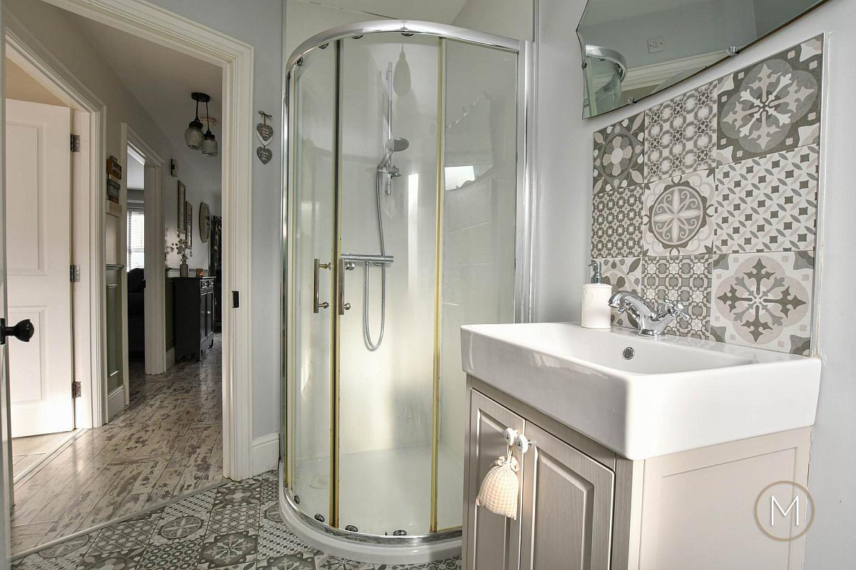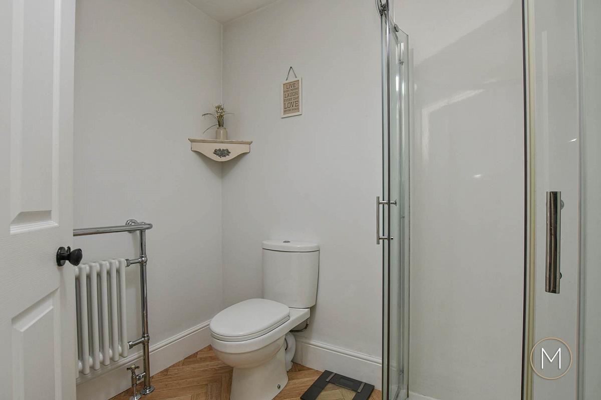 Luxury white suite comprising of low flush W.C; wash hand basin with vanity unit; heated towel radiator; extractor fan; tiled floor; quadrant style shower cubicle with mains powered shower
