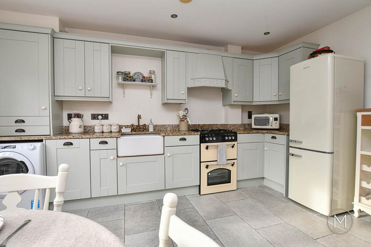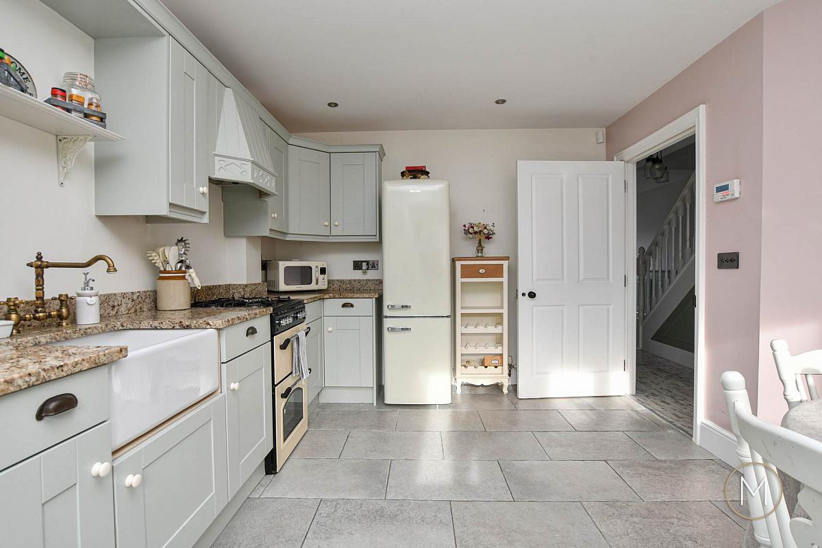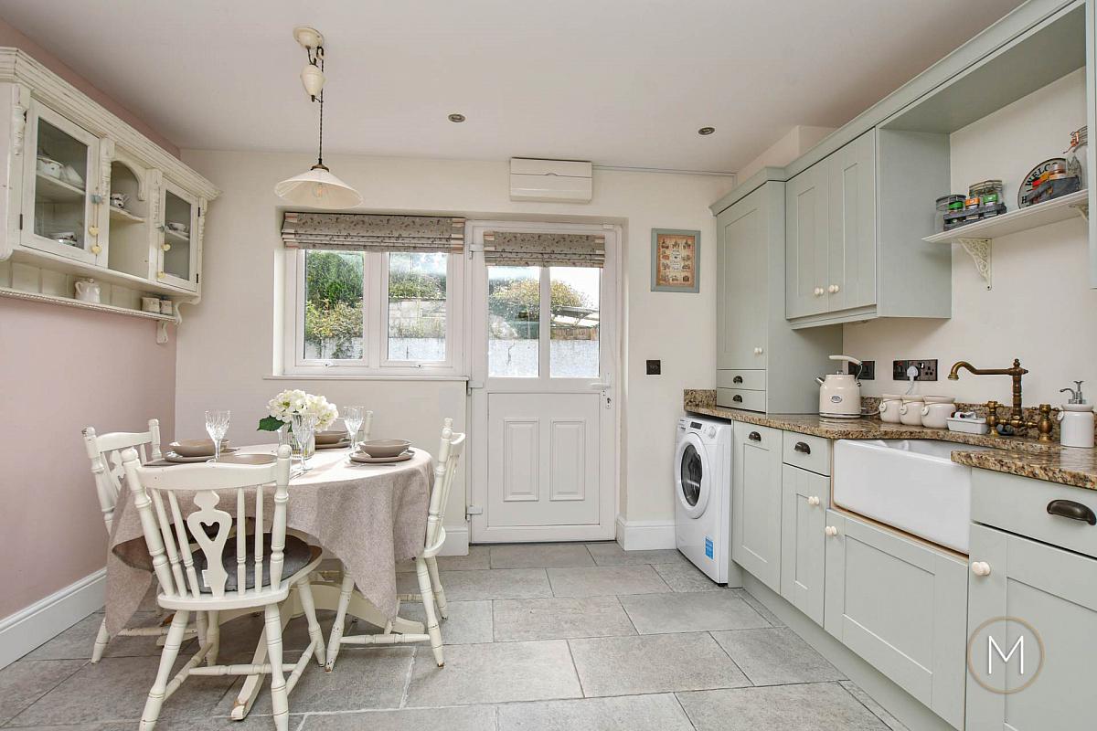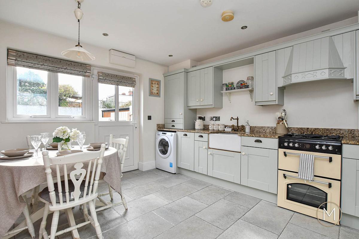 Modern fully fitted kitchen comprising of an excellent range of high and low level units; range cooker with canopy style extractor; Belfast sink; granite work surfaces with matching upstand; plumbed for washing machine; concealed gas boiler; spotlighting; tiled floor; glass panelled door to rear garden