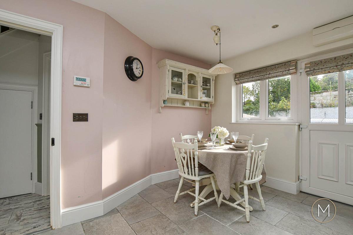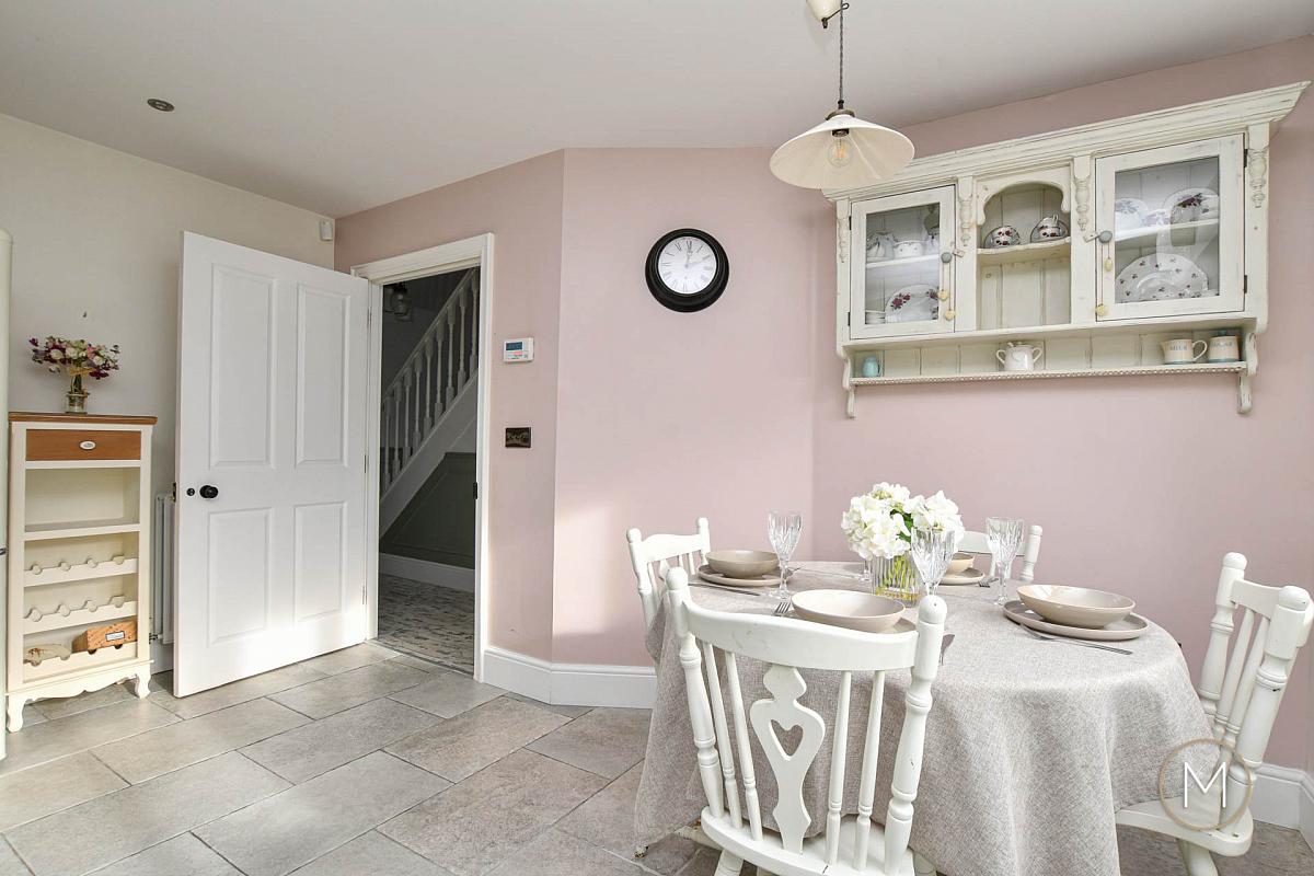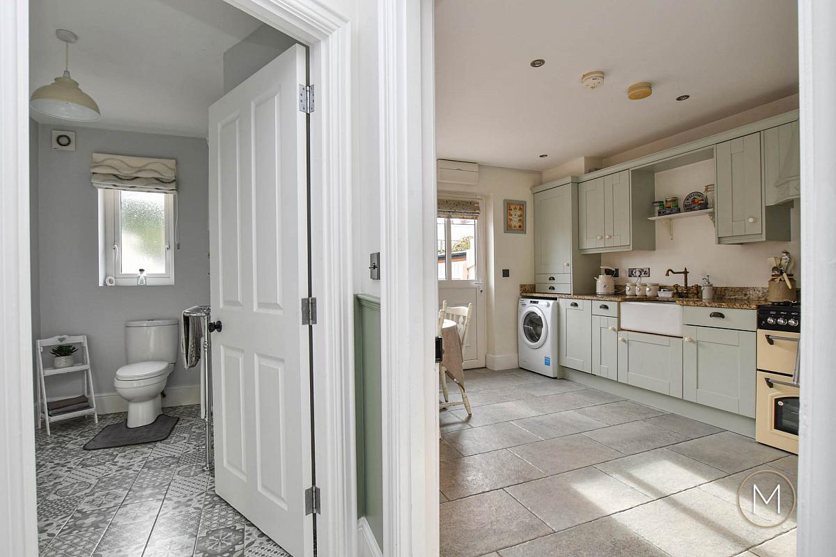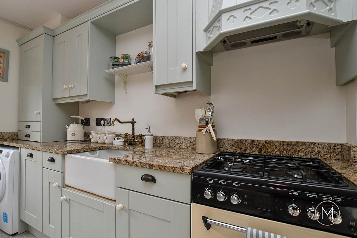 Modern fully fitted kitchen comprising of an excellent range of high and low level units; range cooker with canopy style extractor; Belfast sink; granite work surfaces with matching upstand; plumbed for washing machine; concealed gas boiler; spotlighting; tiled floor; glass panelled door to rear garden