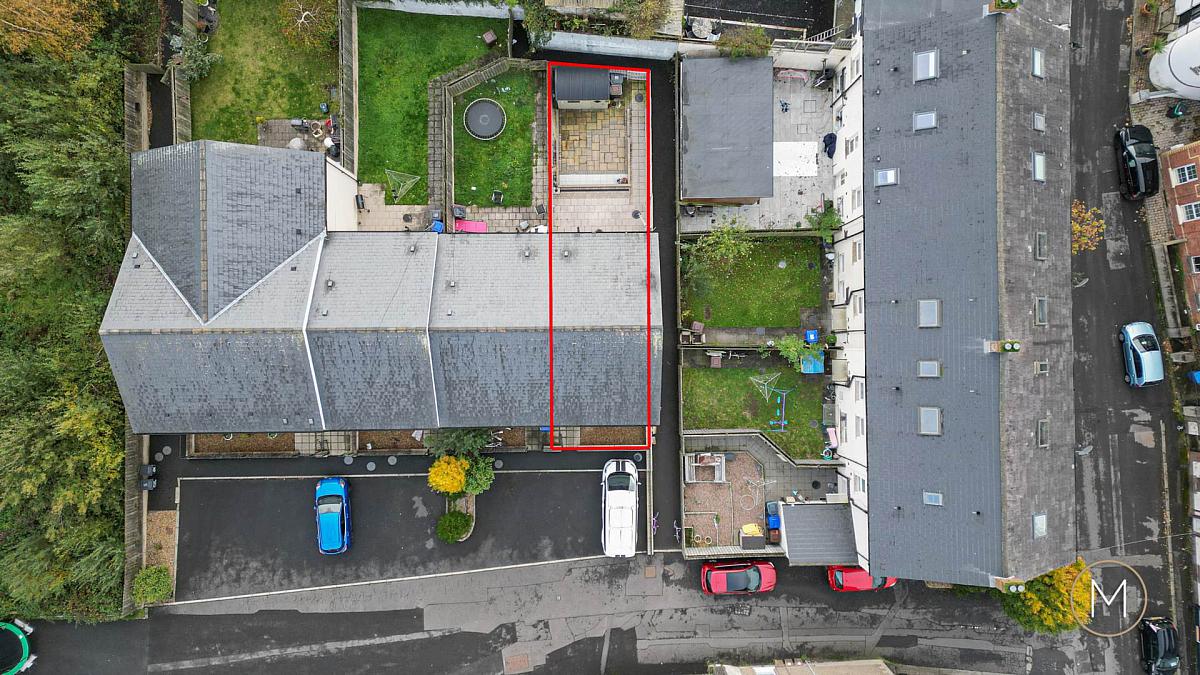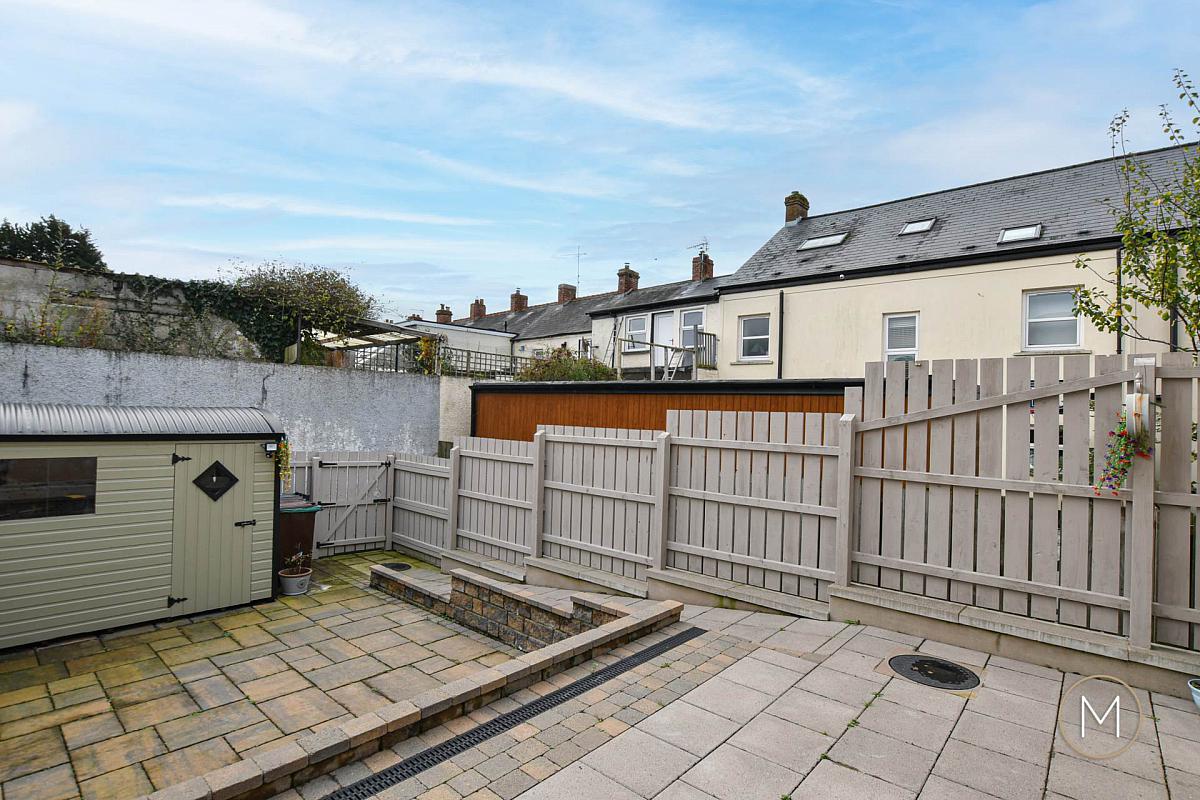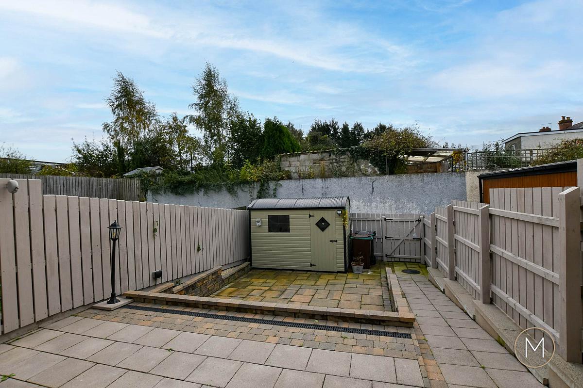 Large enclosed rear garden with paved patio; outside water tap; exterior lighting