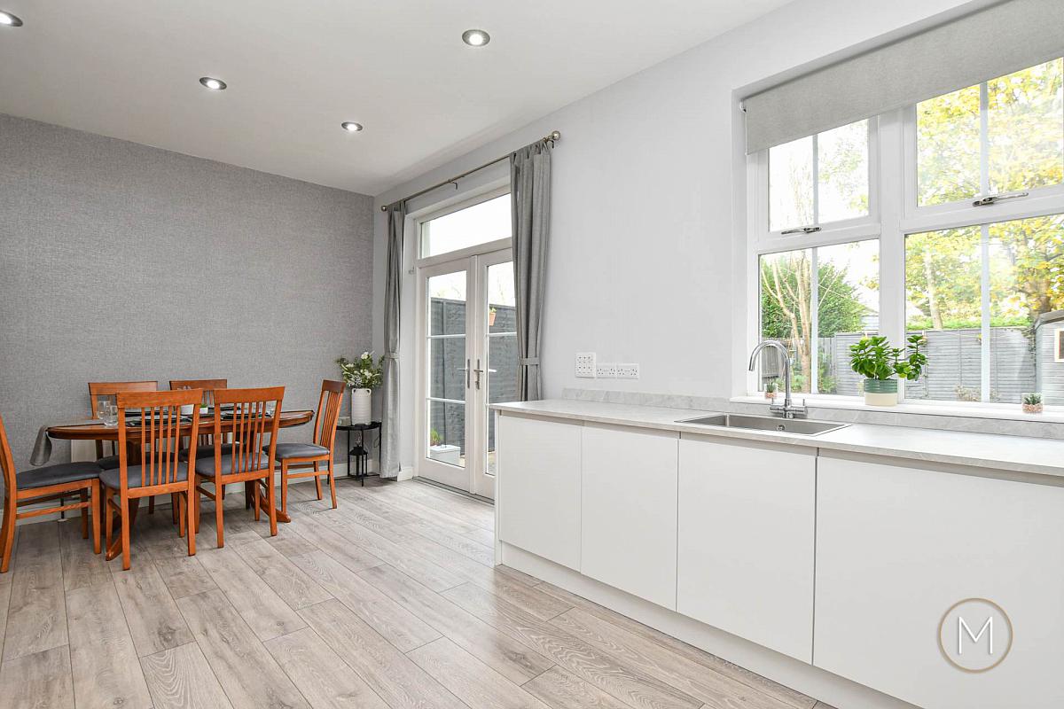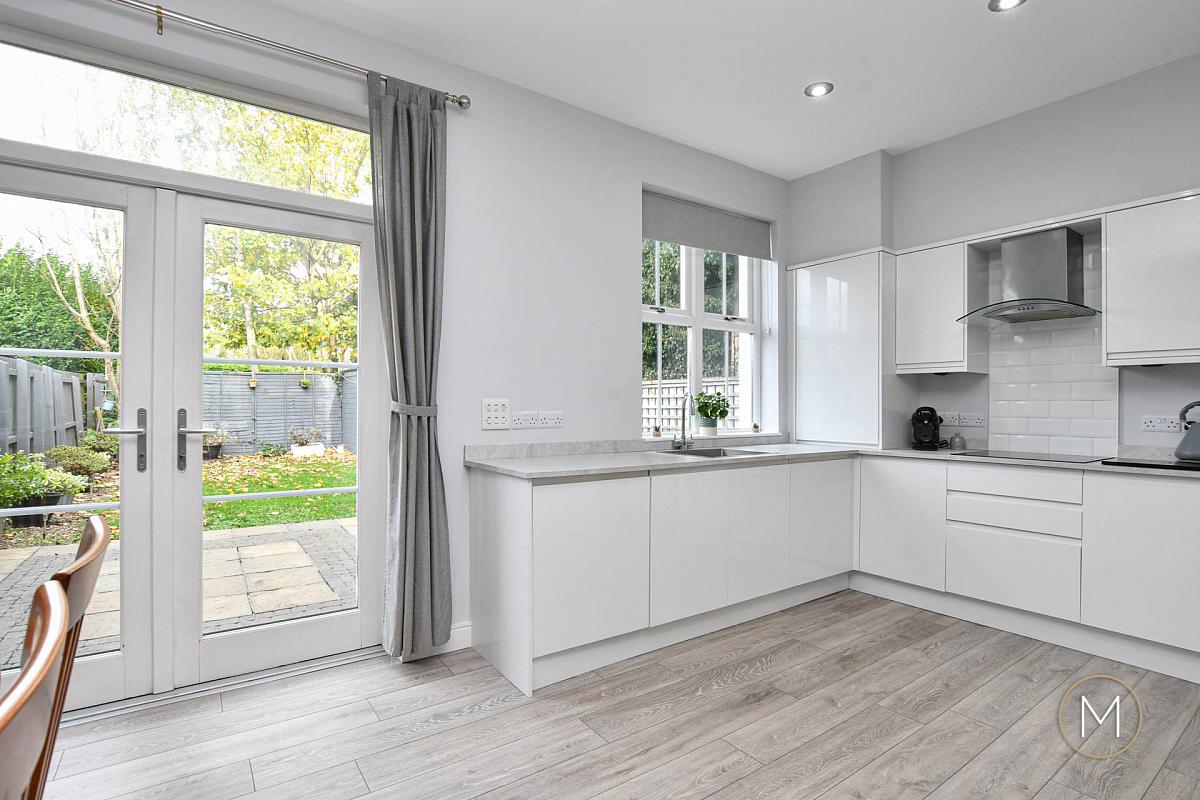 Glazed French-style doors open through to the show-stopping kitchen and dining area a sleek, modern space that has been recently upgraded by the current owner. The kitchen includes a wide range of integrated appliances, ample workspace, and a design that blends practicality with style. The adjoining dining area benefits from glazed double doors leading to the private rear garden, while a convenient downstairs W.C. completes the ground floor.