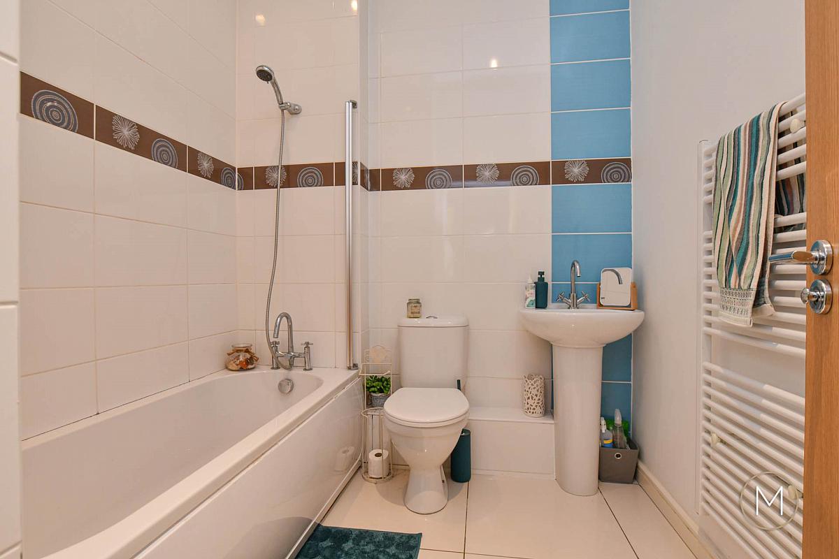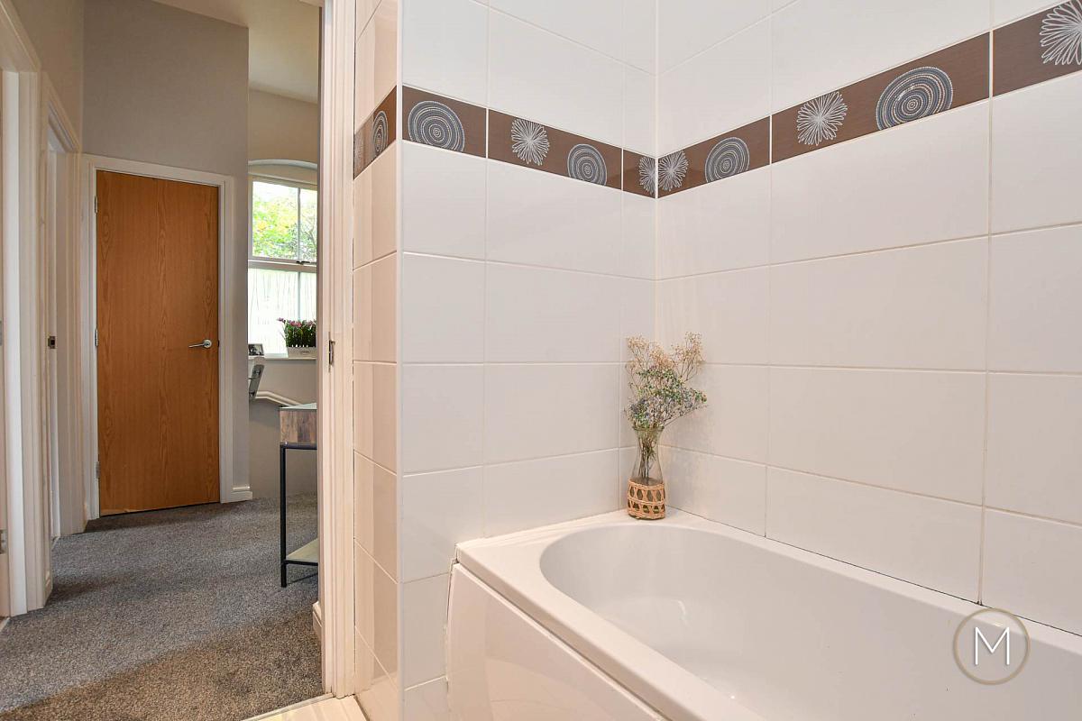 Luxury fitted white suite comprising of panelled bath with chrome mixer tap and separate shower attachment; low flush W.C; wash hand basin; heated towel rail; tiled floor; partially tiled walls; extractor fan; spotlighting