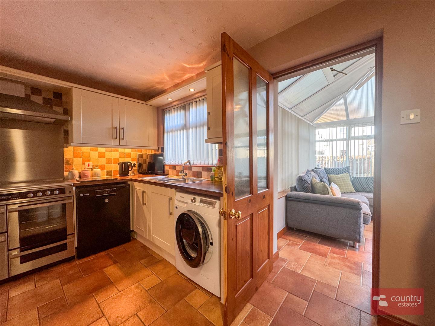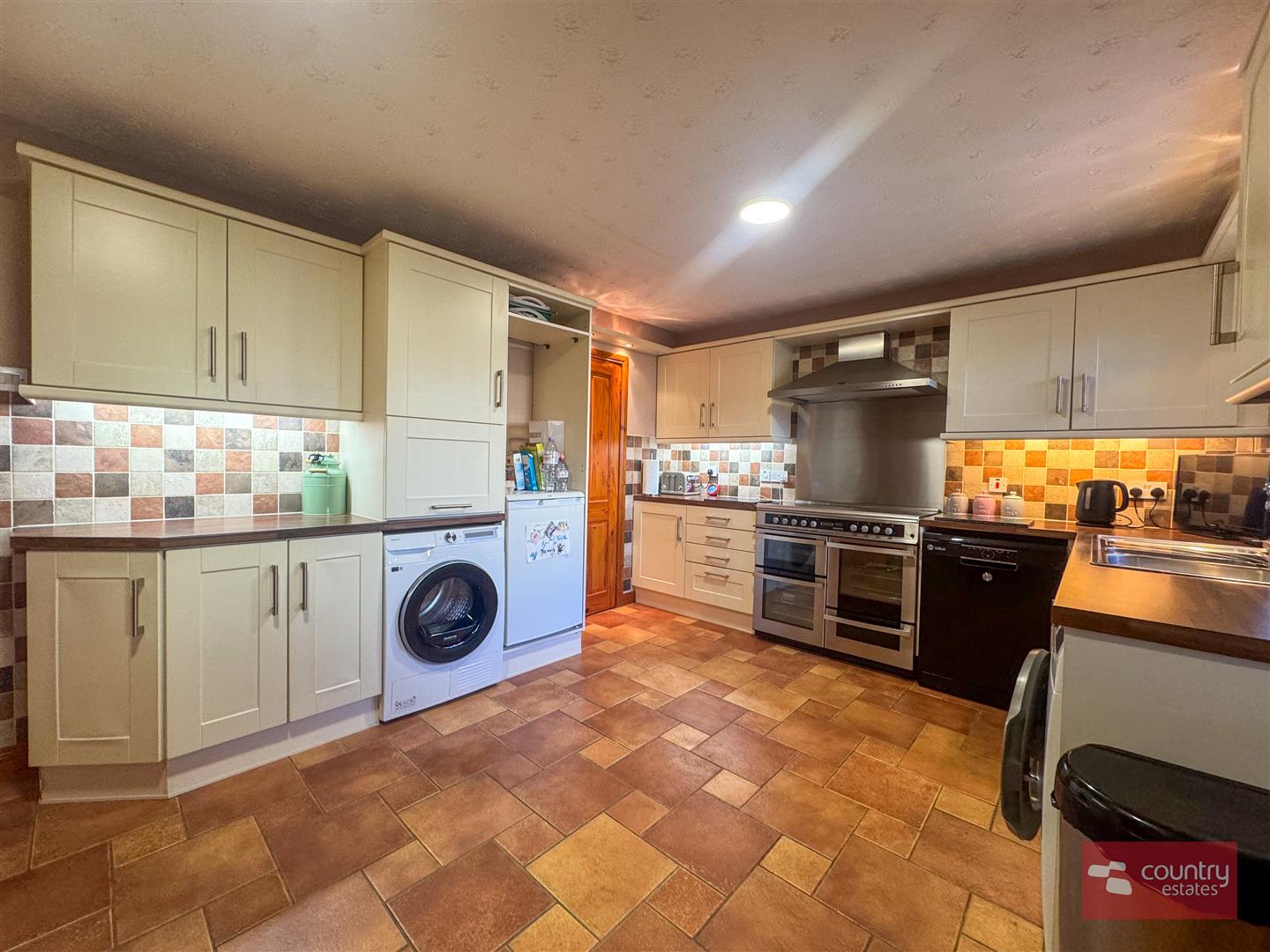 Equipped with a comprehensive range of high and low level modern fitted shaker style units in cream with co-coordinating work surfaces. 'Leisure' double oven with 5 ring gas hob and stainless steel overhead extractor fan. Space for freestanding washing machine, tumble drier, dishwasher and fridge/freezer. Storage cupboard. Part tiled walls. Tiled floor extending through to:-