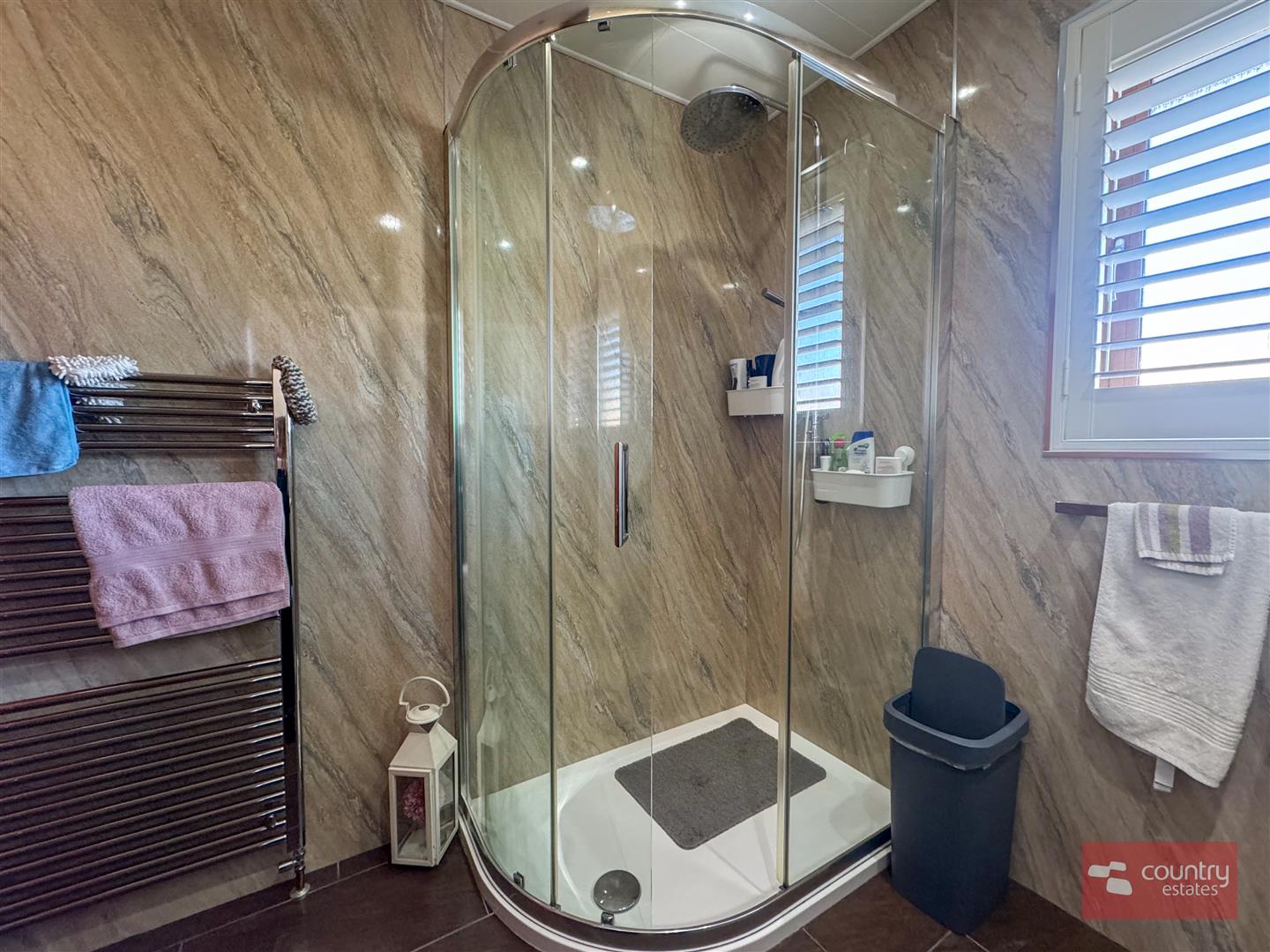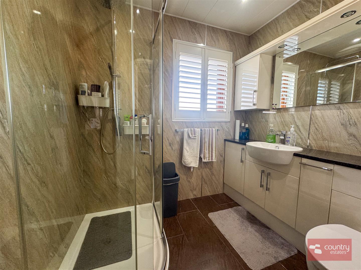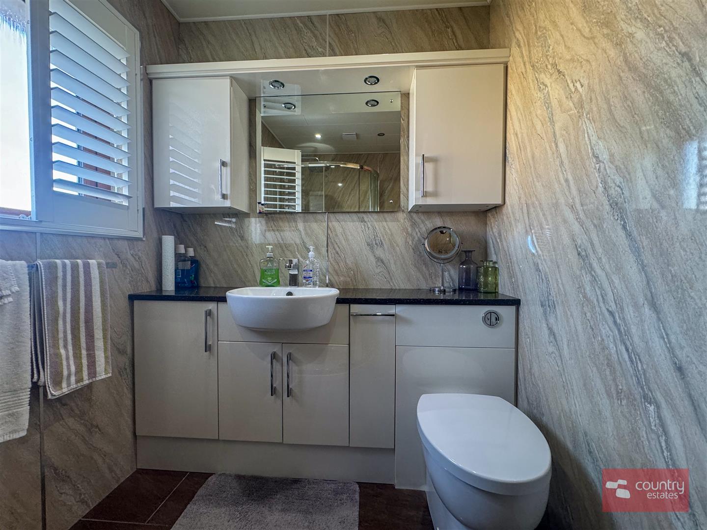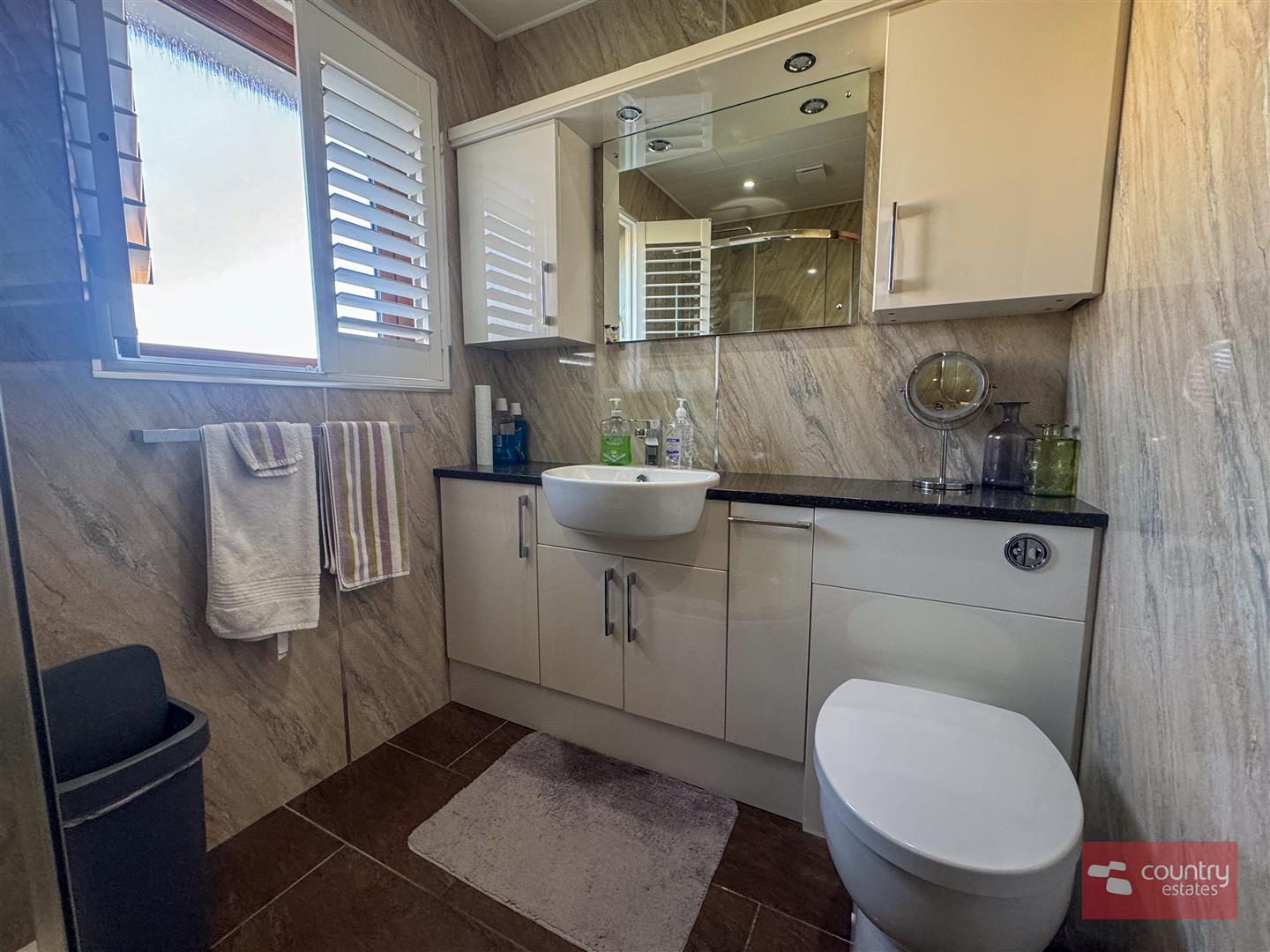 Comprising modern gloss vanity storage unit with inlaid sink, mixer tap and push button w.c. Quarter rounded shower enclosure with thermostatically controlled rainfall shower overhead. Chrome towel rail. PVC waterproof panelling to ceiling and walls. Tiled floor.