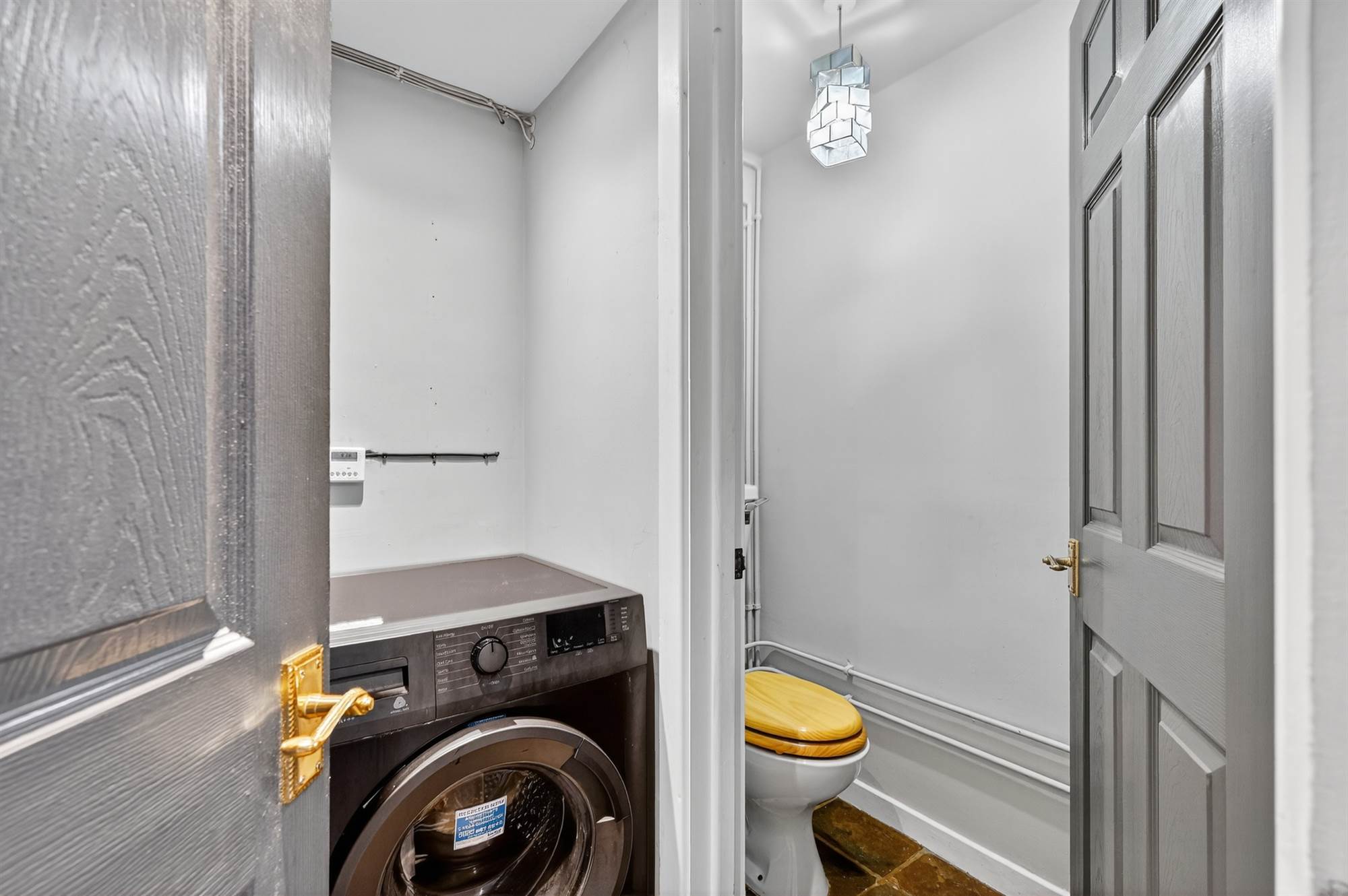 Plumbed for washing machine.  Storage, low flush wc, wash hand basin with mixer tap.