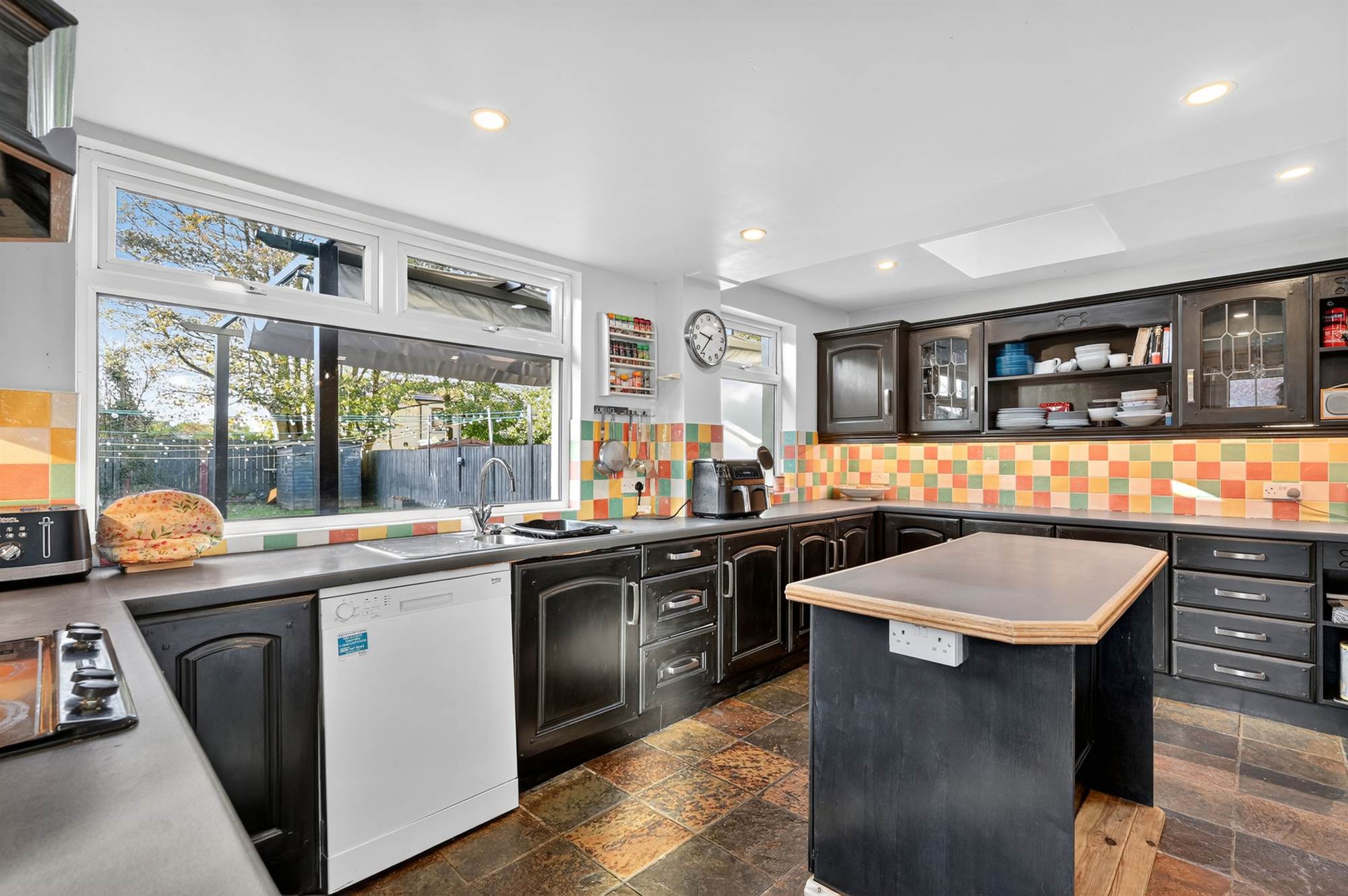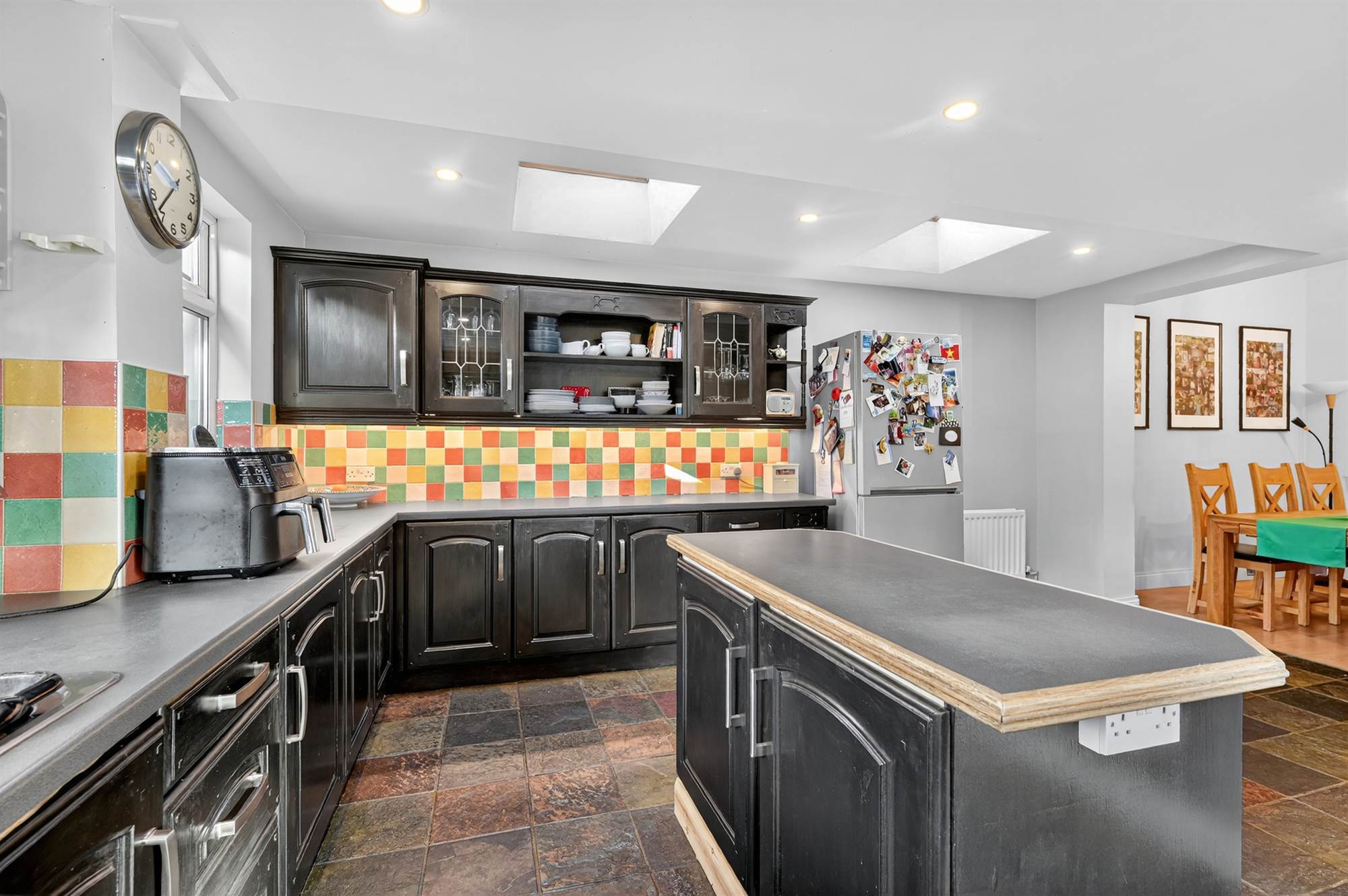 (at widest points).  Range of high and low level units, work surfaces, one and a half bowl stainless steel sink unit with mixer tap.  Space for fridge/freezer, underbench oven, four ring hob, extractor fan.  Feature glazed cabinet.  Plumbed for dishwasher, tiled splashback, island unit.  Skylight windows, uPVC door to rear.  Chinese slate tiled floor.  Open to living/dining area.