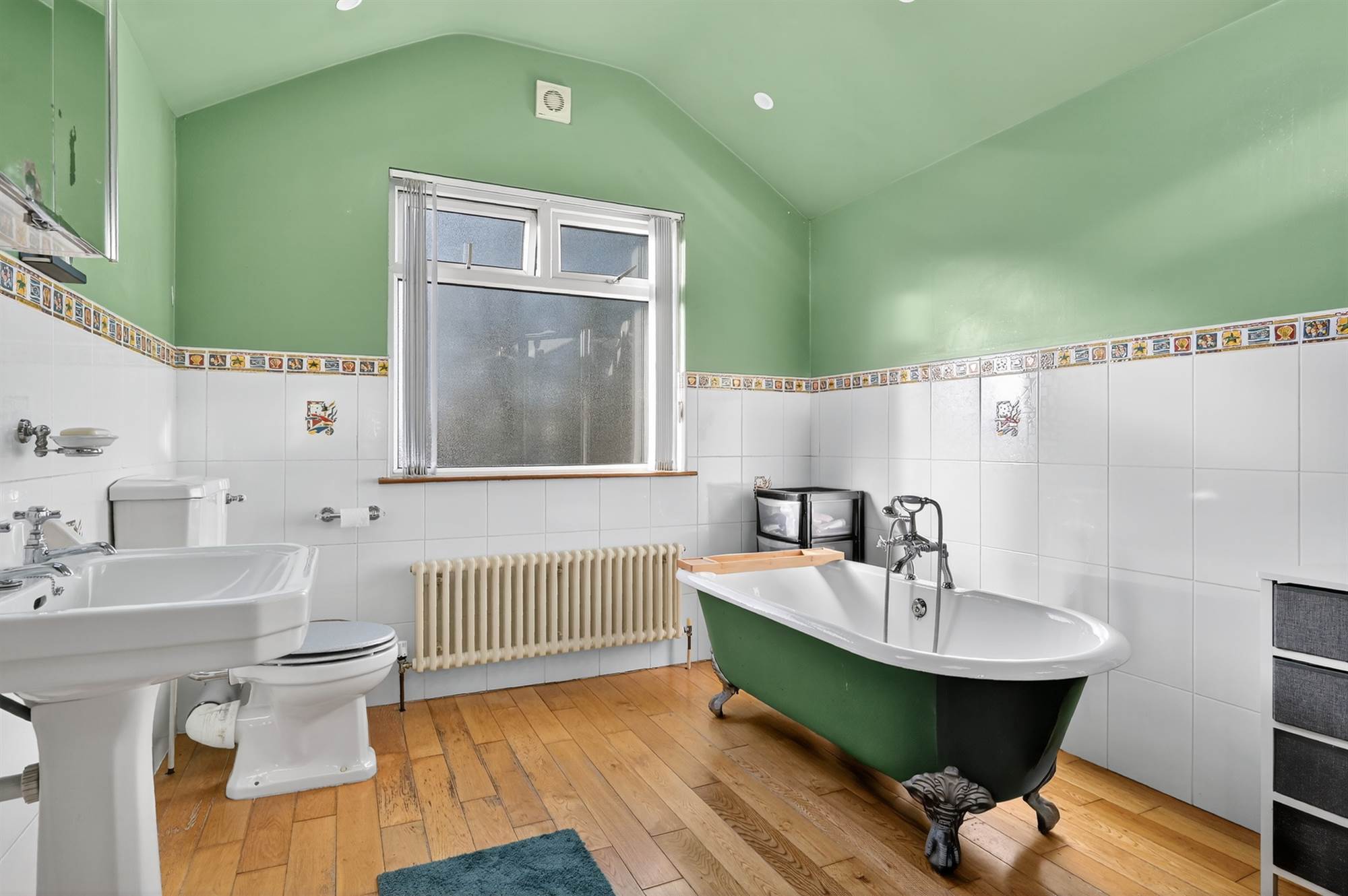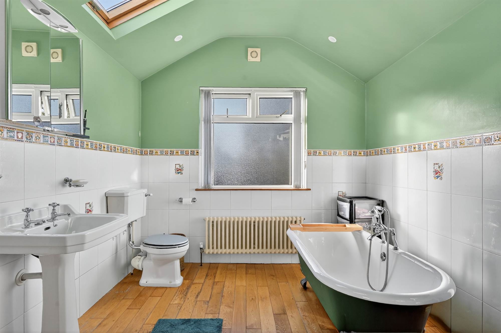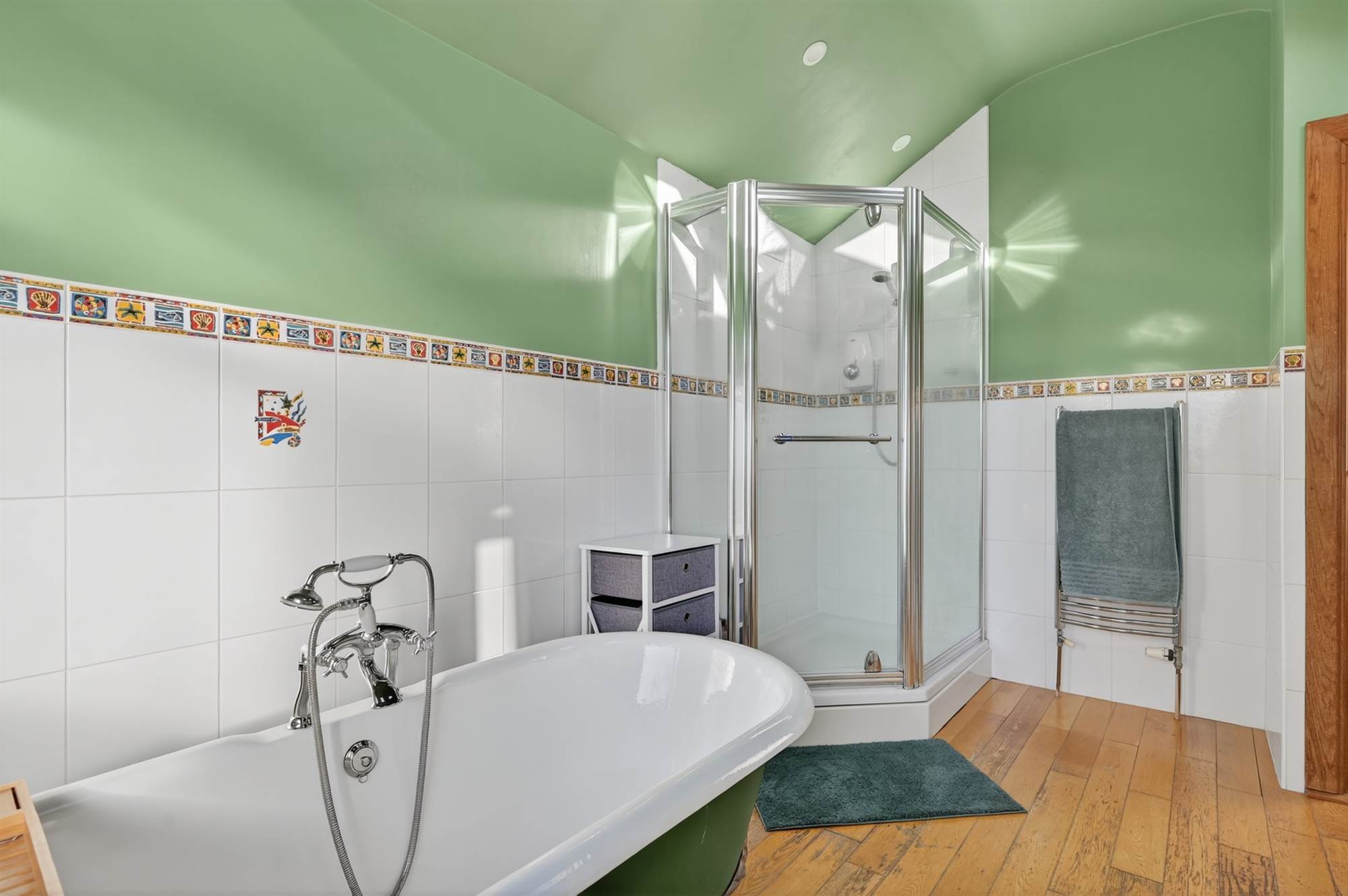 White suite comprising low flush wc, pedestal wash hand basin with mixer taps.  Free standing "claw foot" bath with mixer tap.  Double shower cubicle with electric shower, chrome heated towel rail.  Part tiled walls, spotlights.  Wall mounted cabinets. Two Skylights.  Solid wooden flooring.