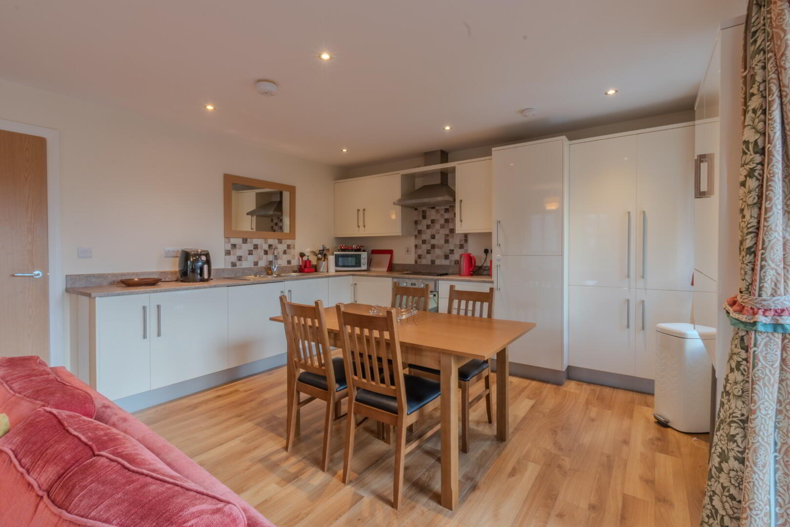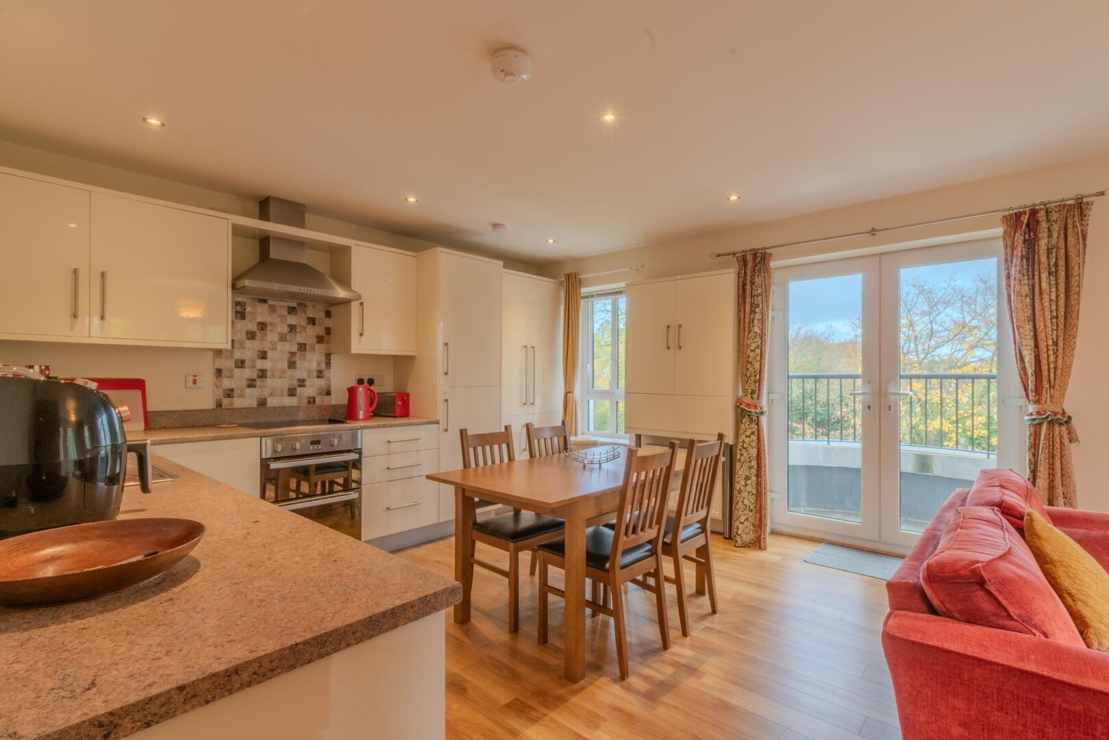 OPEN PLAN KITCHEN / LIVING with modern fitted units and access to balcony