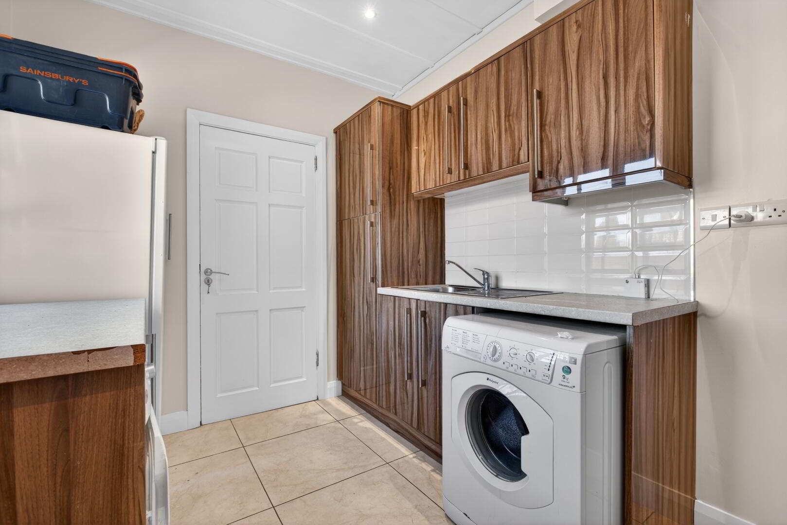 Range of high gloss units, plumbed for washing machine, space for tumble dryer, space for fridge freezer, part tiled walls, tiled flooring, built in storage cupboard, recessed ceiling lighting, window to rear, uPVC door to rear