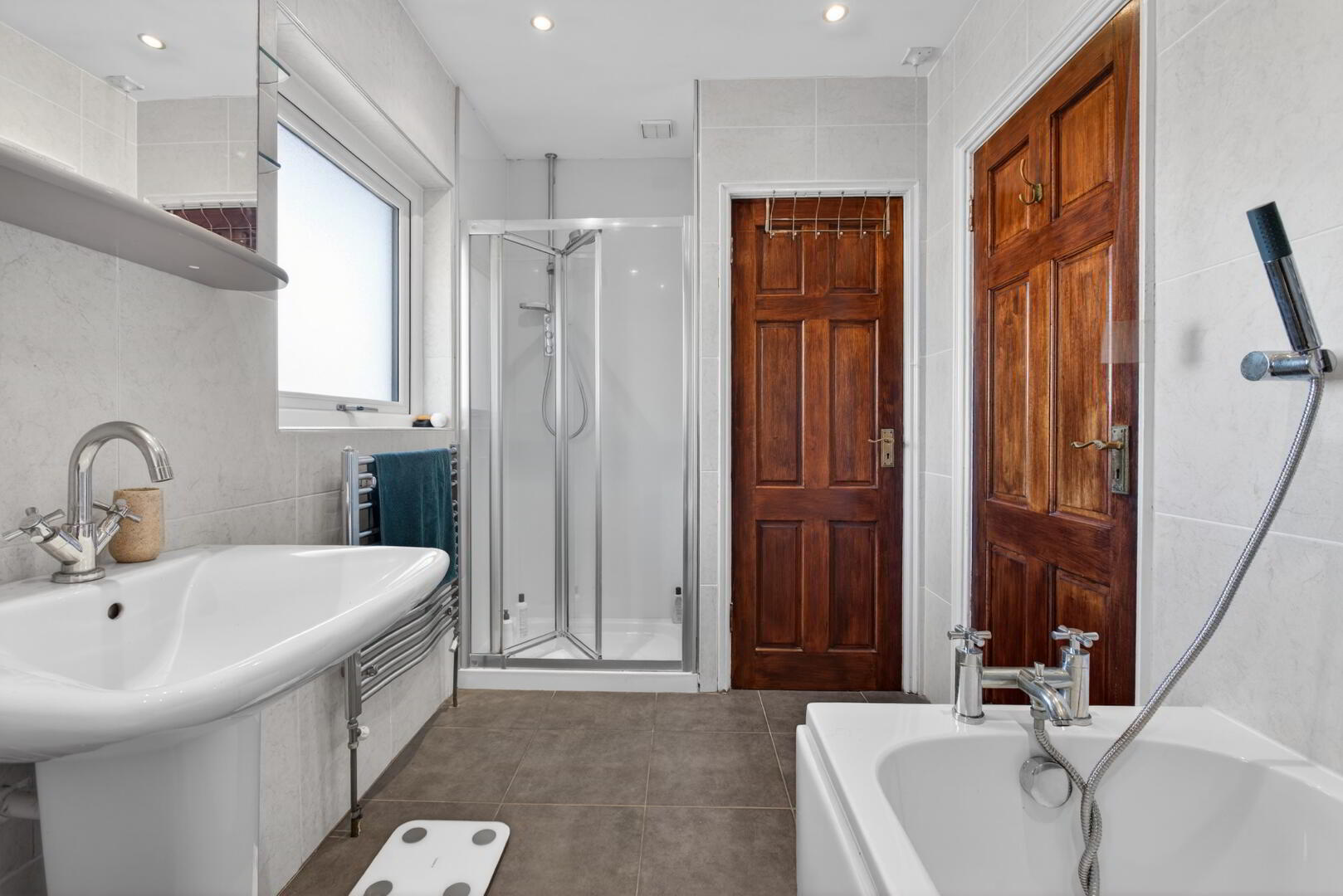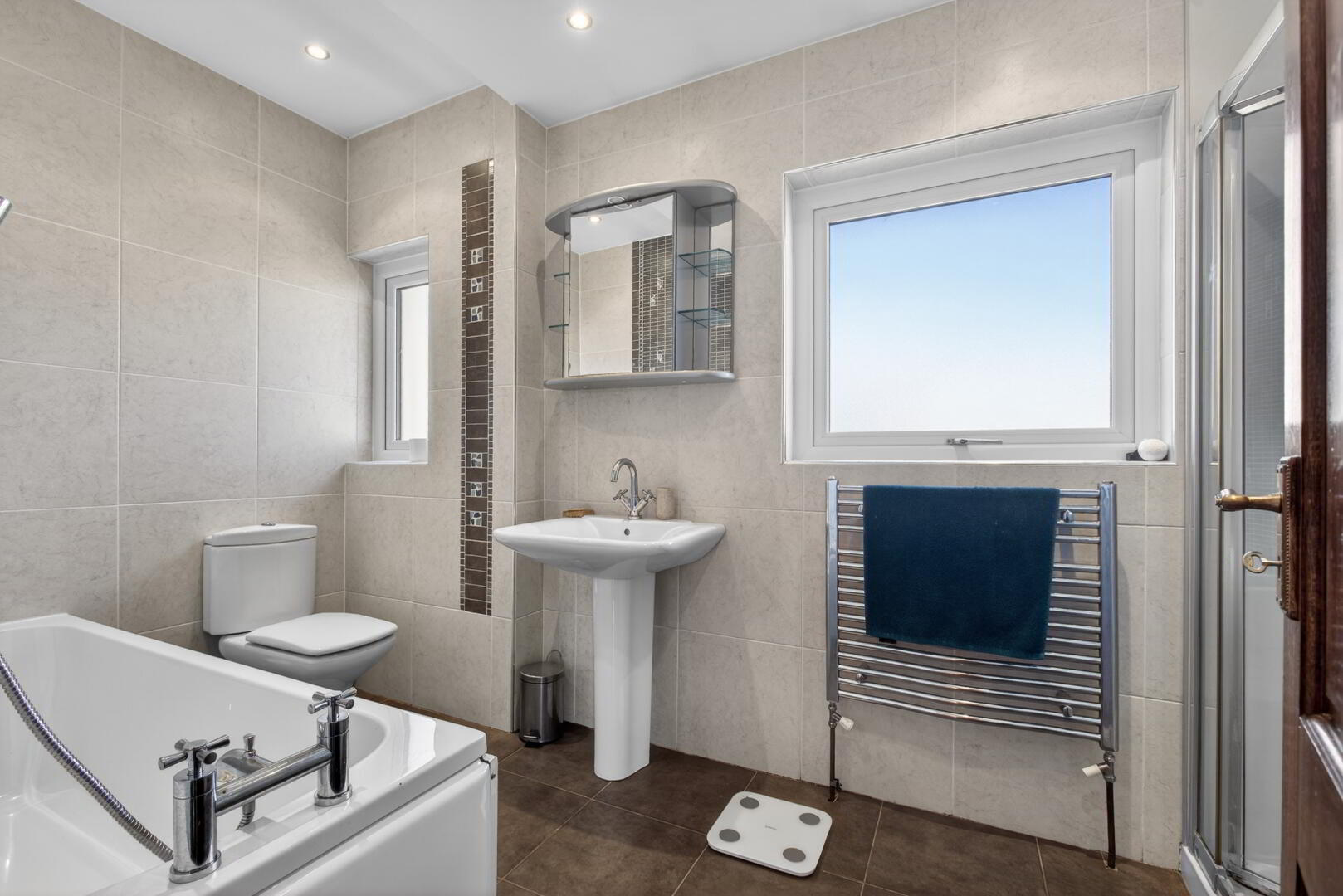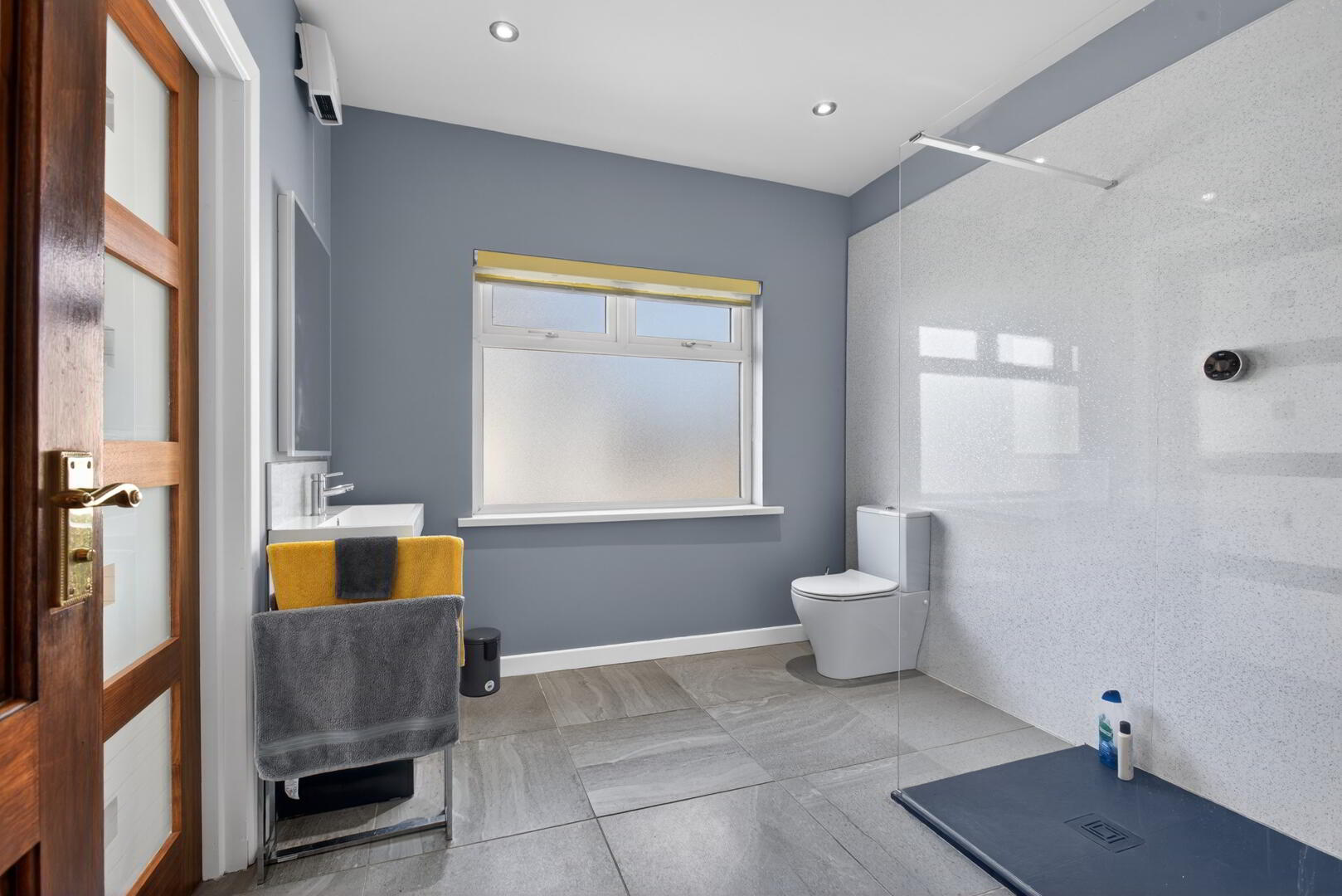 4 piece suite comprising of bath, mixer tap with hand held shower, low flush wc, pedestal wash hand basin, step in shower cubicle with Aqualisa shower, chrome radiator towel rail, hot press, recessed ceiling lights, fully tiled walls and flooring, uPVC double glazed windows to rear