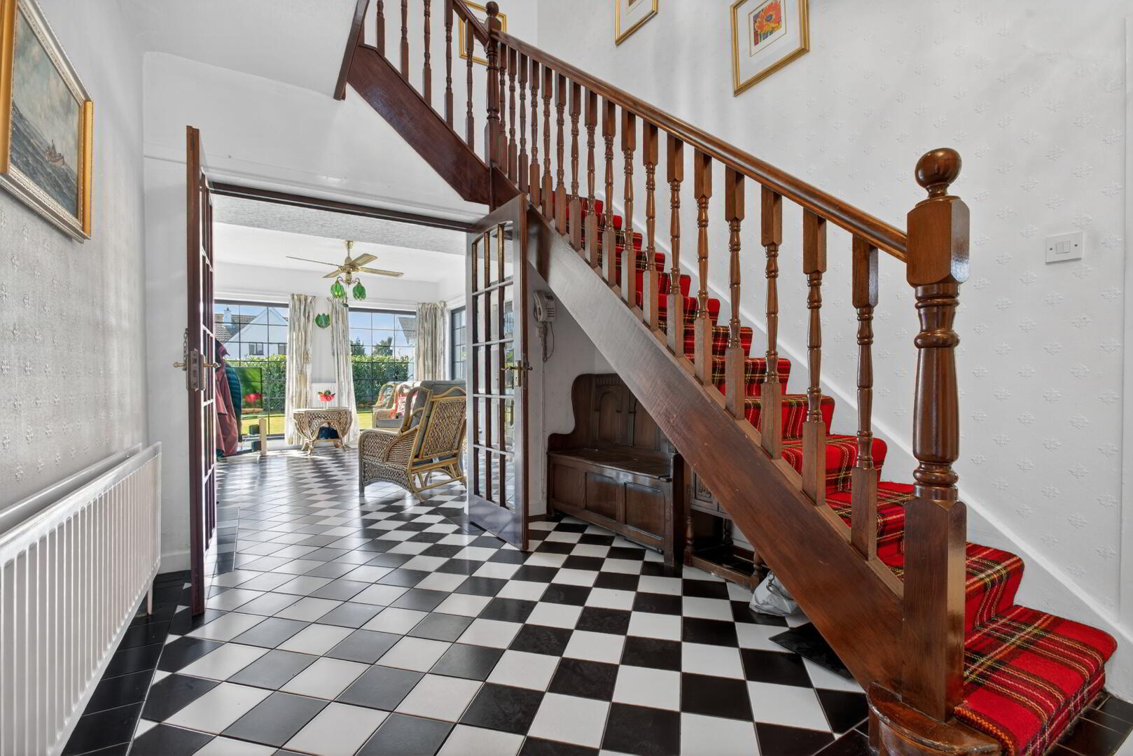Staircase to first floor, tiled floor, radiator, door to lounge, ground floor wc and kitchen/diner/family room