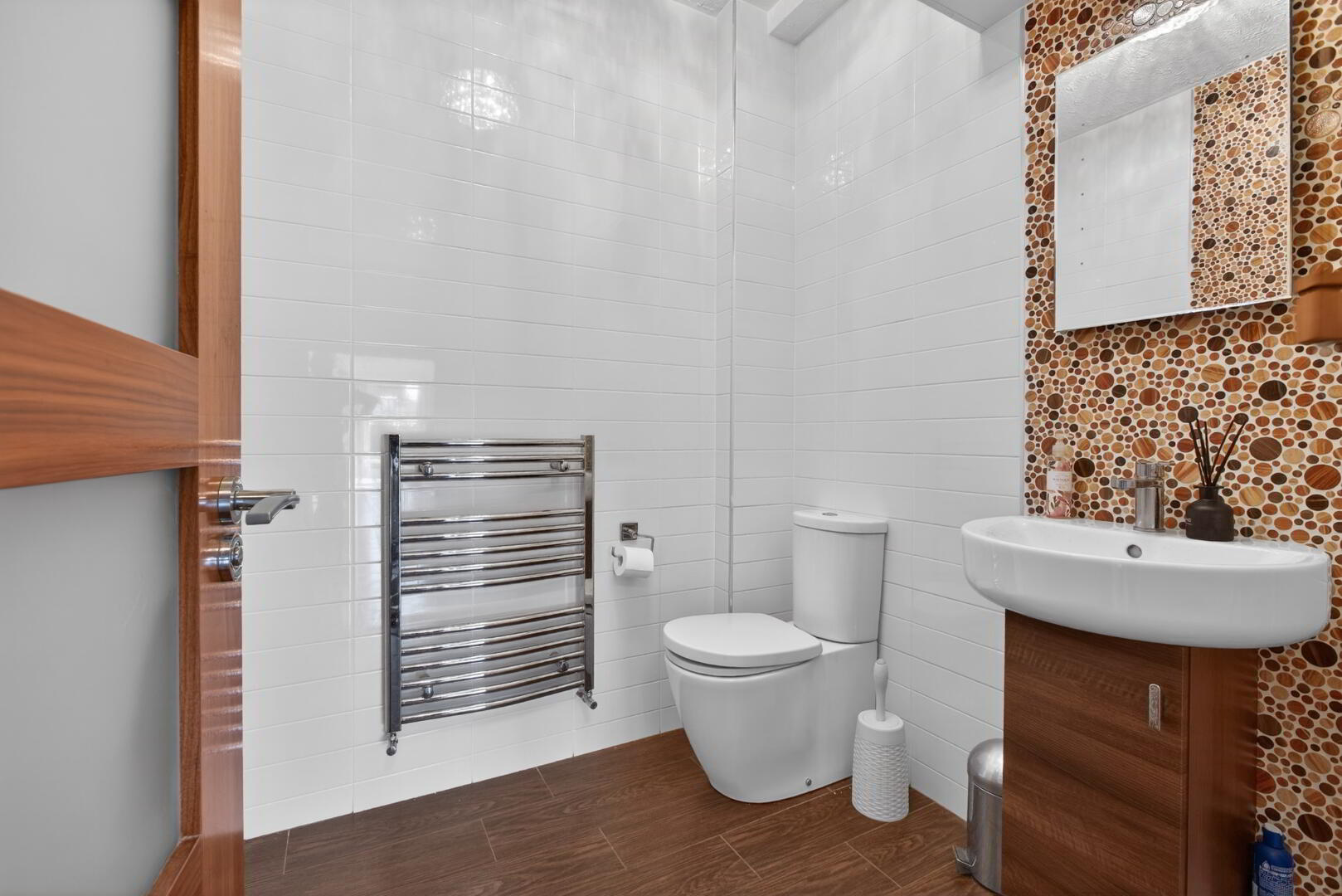 Low flush wc, wash hand basin with mixer tap set on vanity unit, fully tiled walls and flooring, chrome radiator towel rail