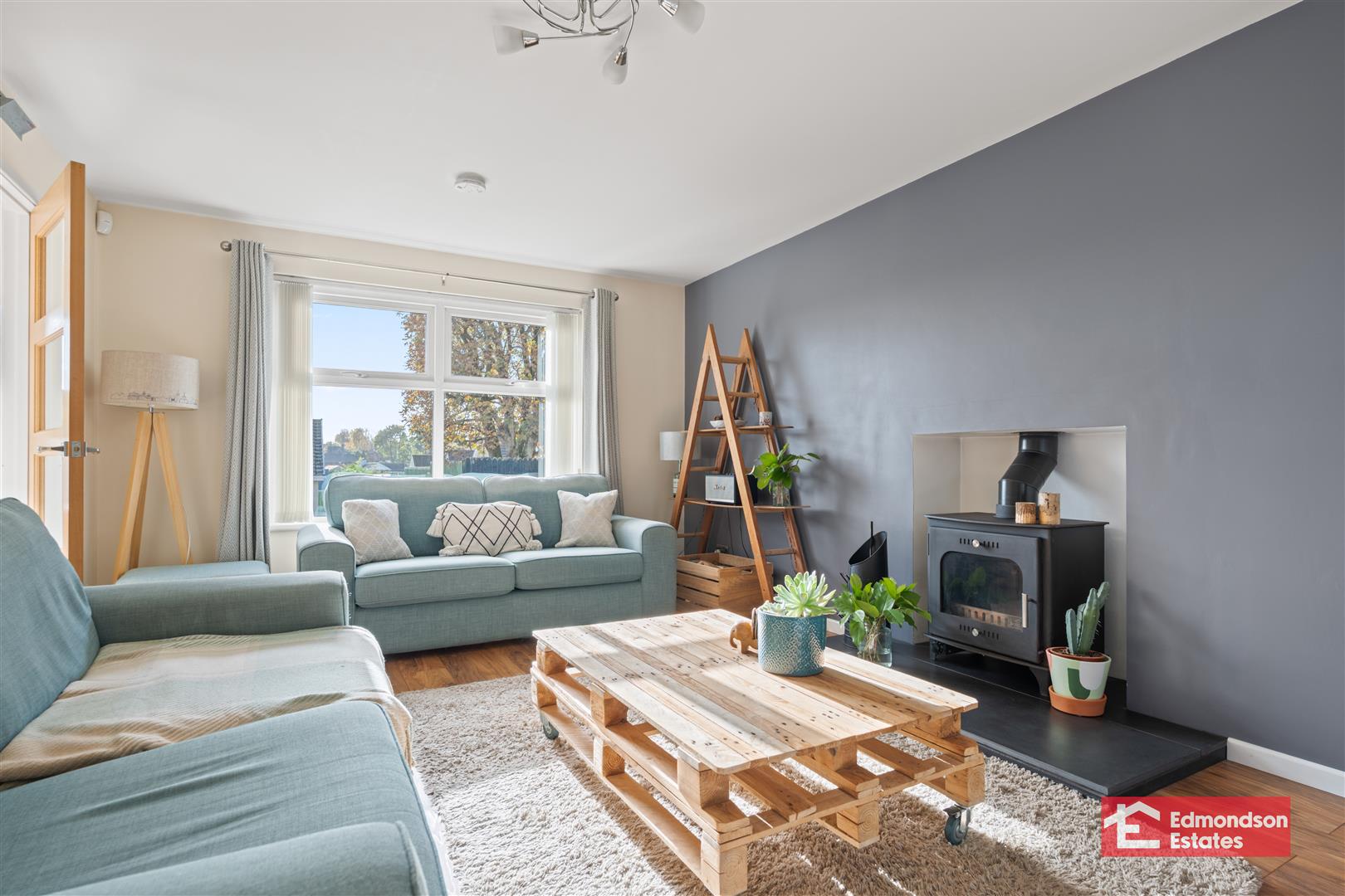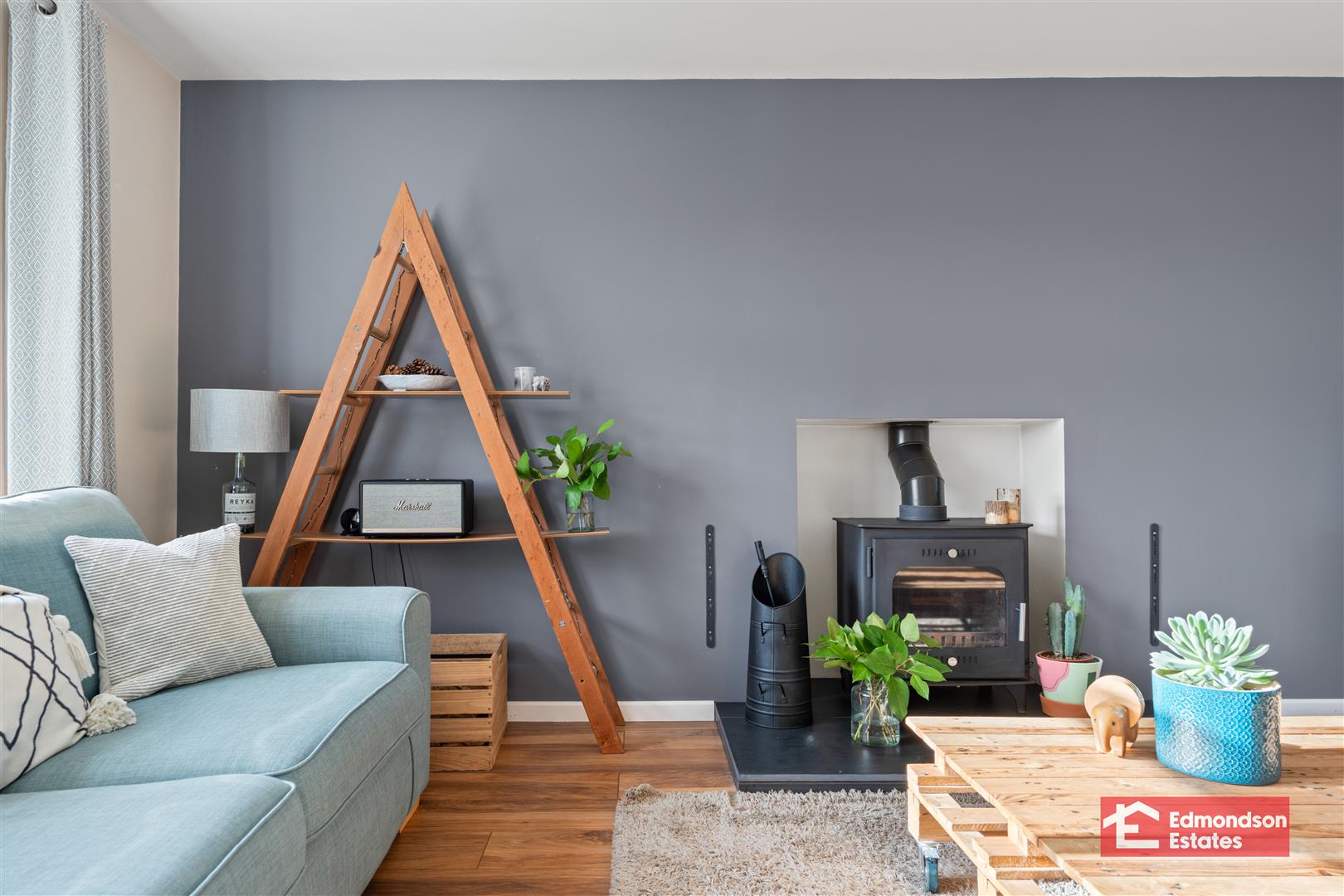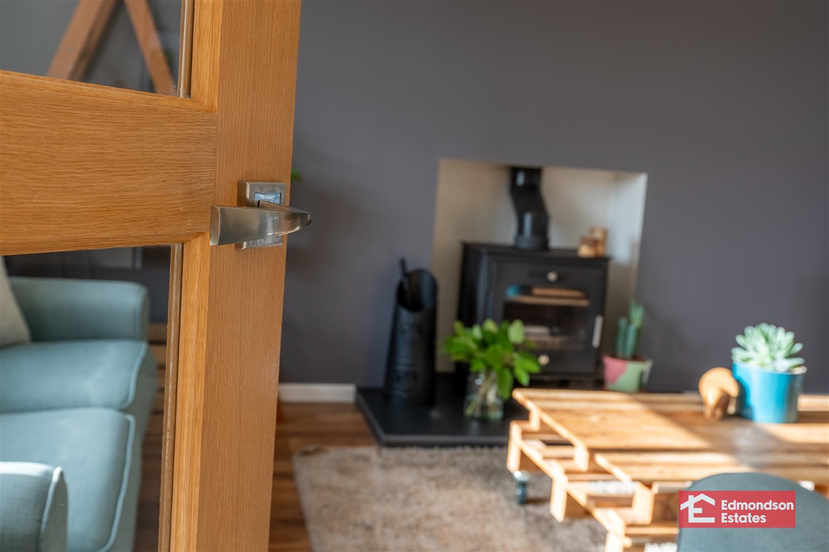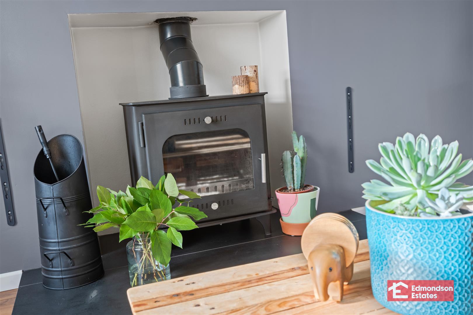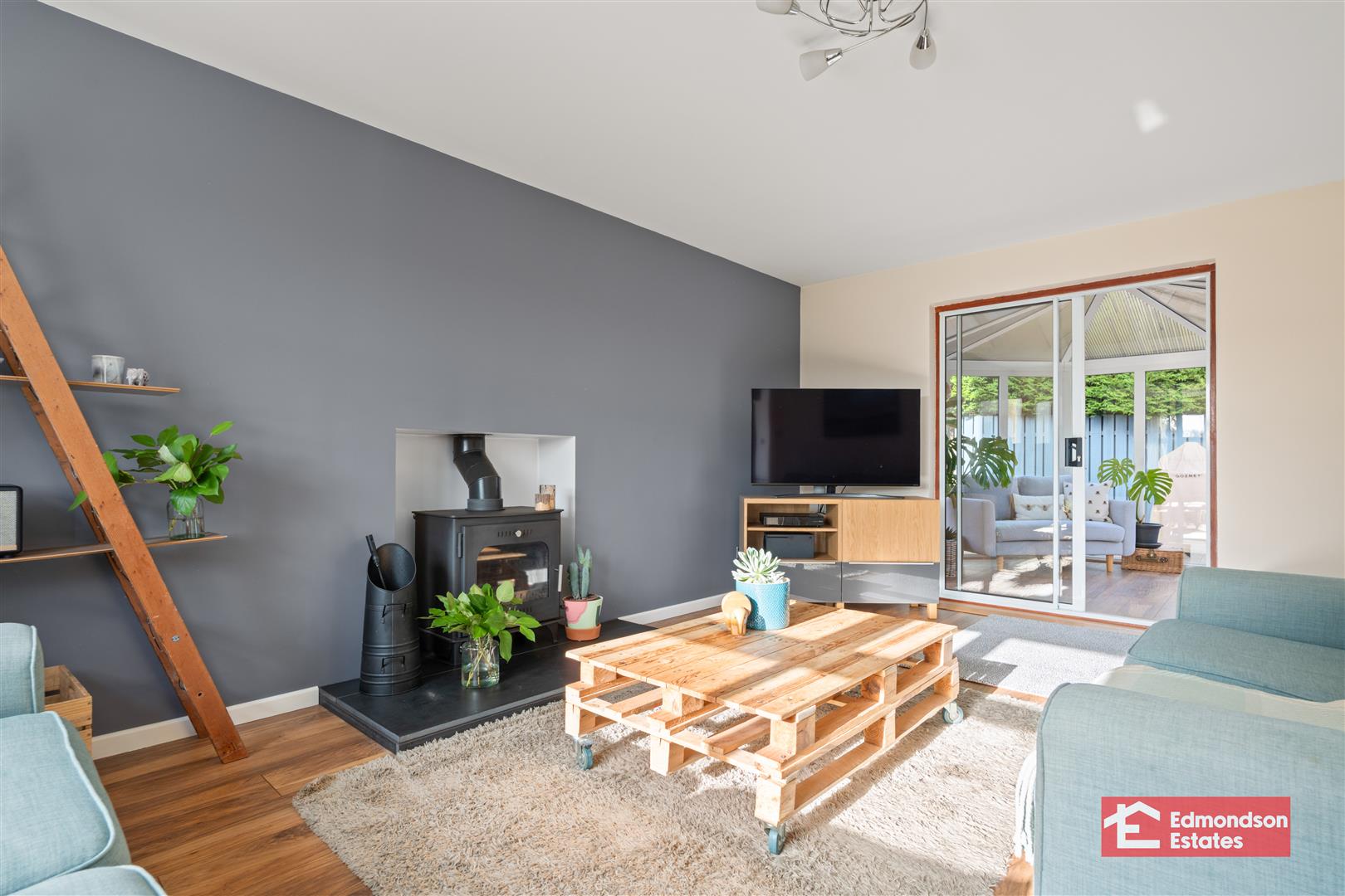 Focal point multi-fuel stove (with back boiler link up) in Inglenook style recess on slate hearth. PVC double glazed sliding doors to conservatory.