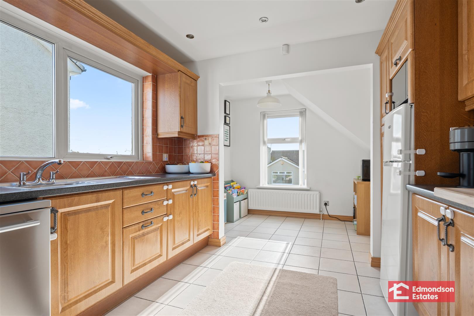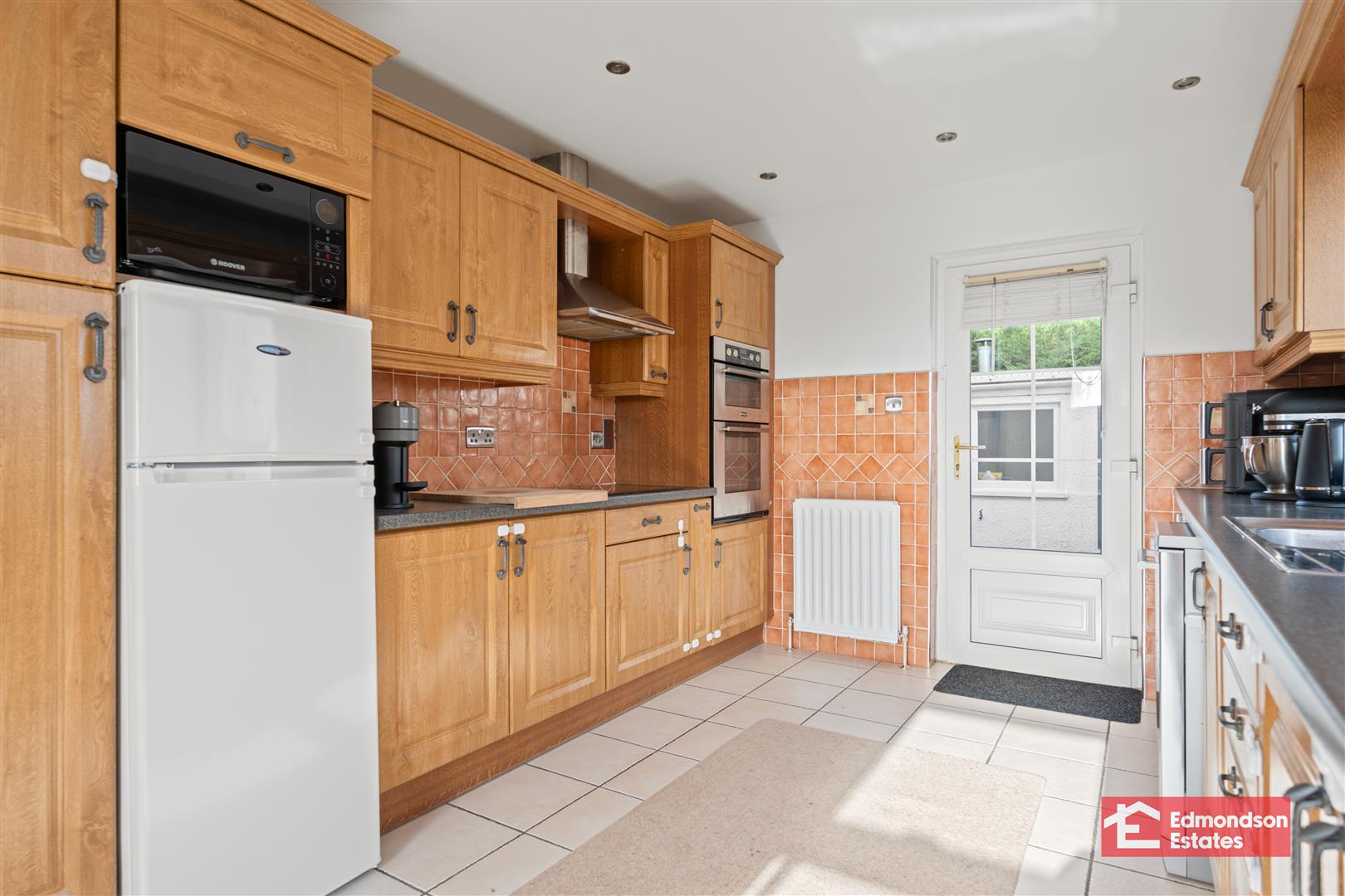 Modern fitted kitchen with high and low level storage units and work surfaces. Integrated eye level grill and oven, 4 ring electric hob with stainless steel extractor fan over. Stainless steel sink unit. Space for slimeline dishwasher and fridge freezer. PVC double glazed rear door. Tiled floor.
