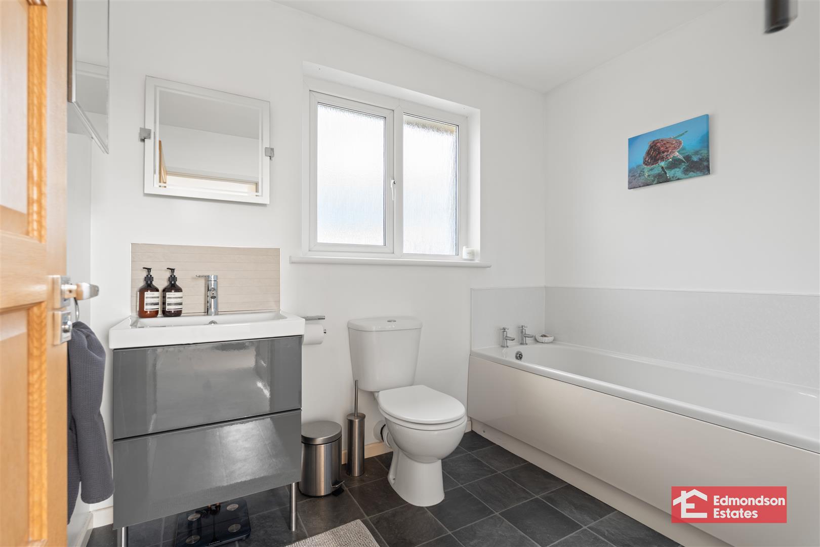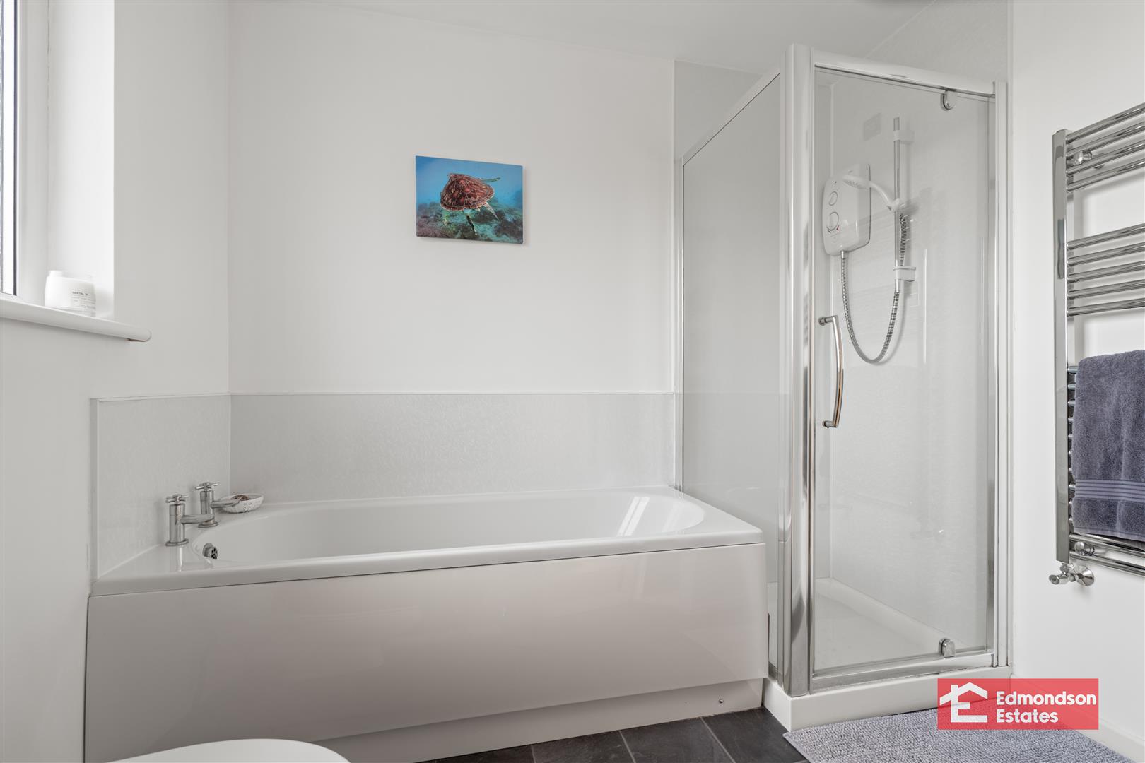 Modern fitted four piece suite comprising panelled bath, shower cubicle with electric shower over, vanity unit, and WC. Chrome towel radiator. Part tiled walls to shower and tiled floor.