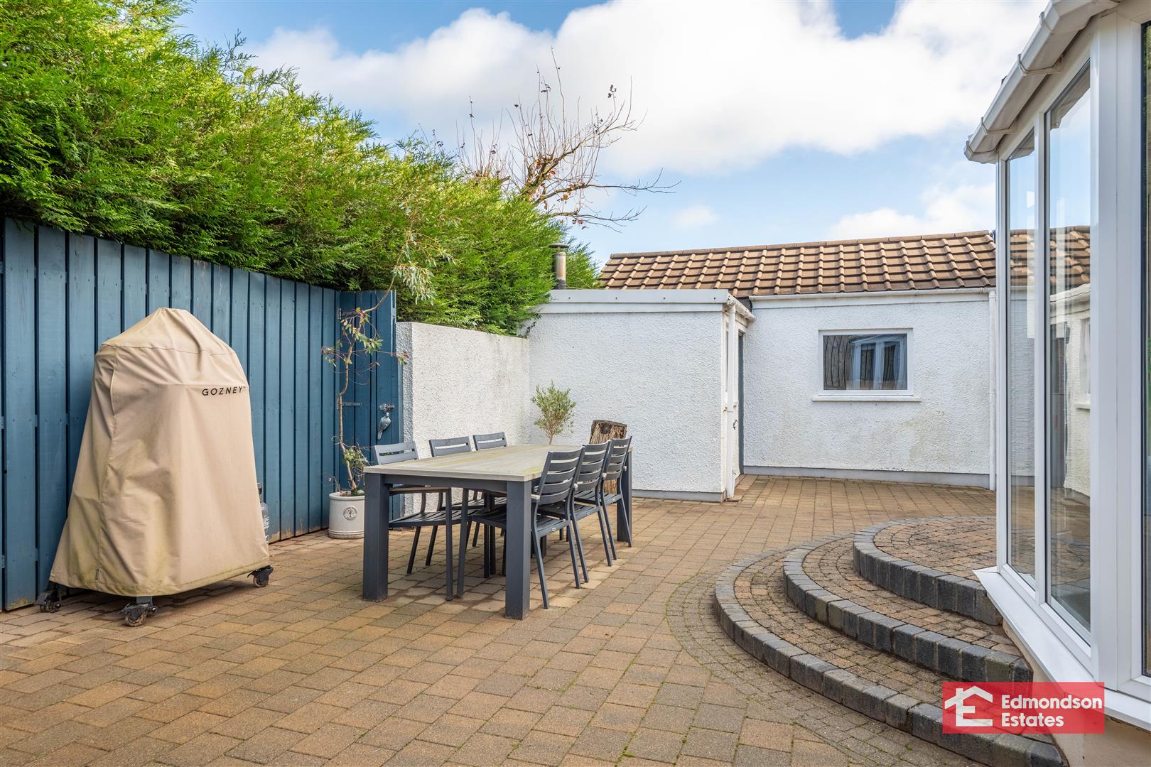 Low maintenance rear garden in brick pavior enjoying evening sun.