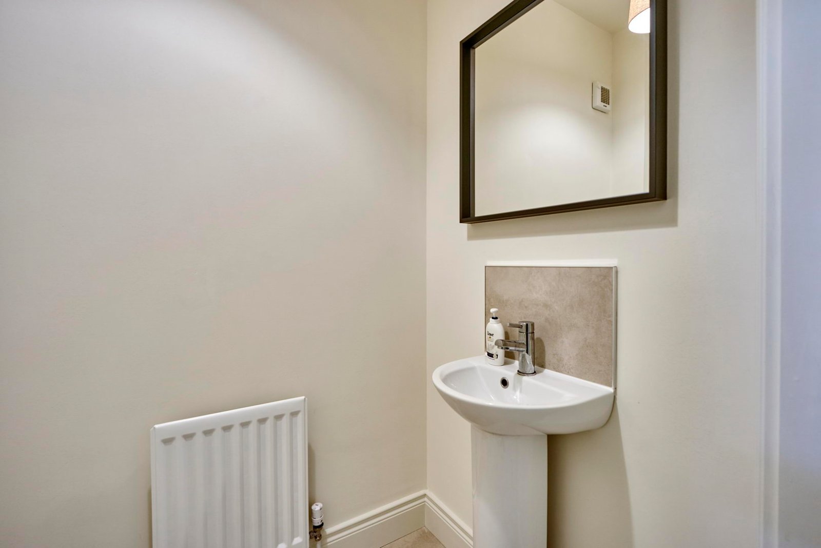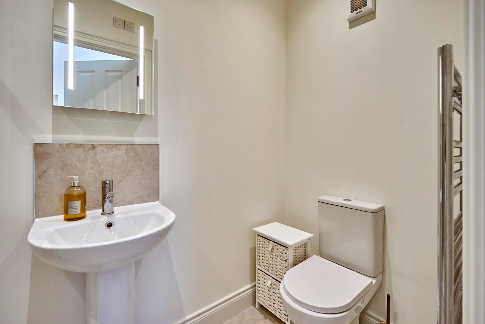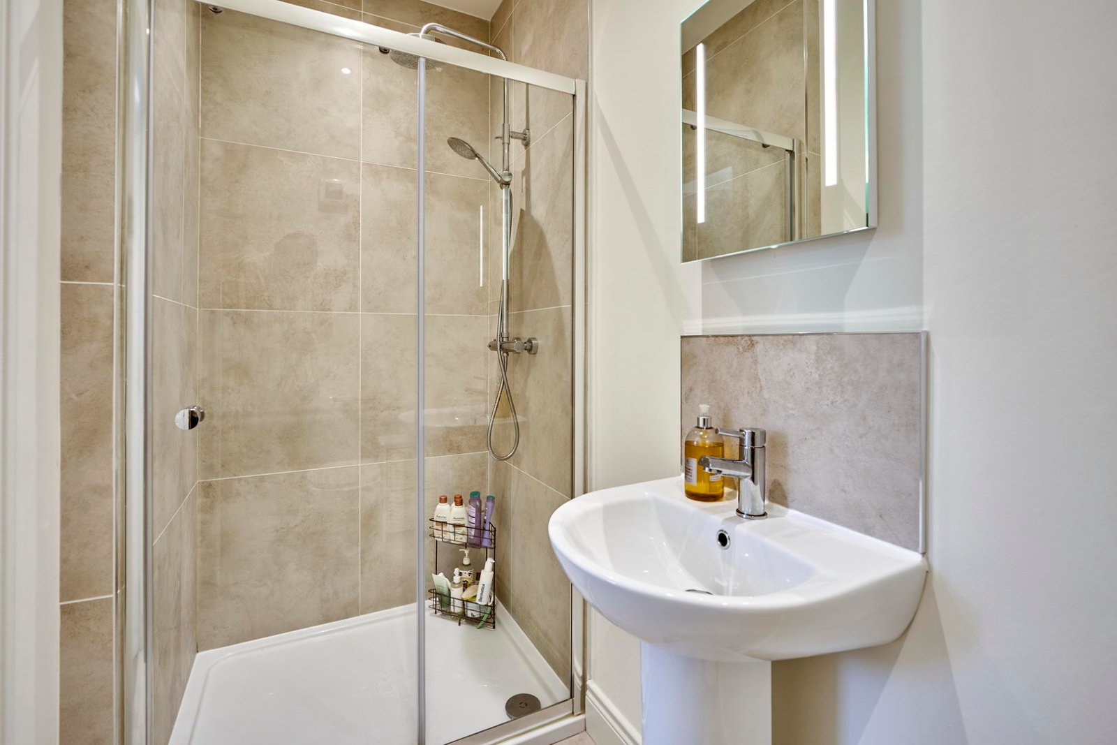 Contemporary white suite comprising: Low flush WC, pedestal wash hand basin with chrome mixer taps and tiled splashback, fully tiled shower cubicle with chrome thermostatic shower unit, chrome heated towel radiator, ceramic tiled floor, extractor fan, low voltage spotlighting.