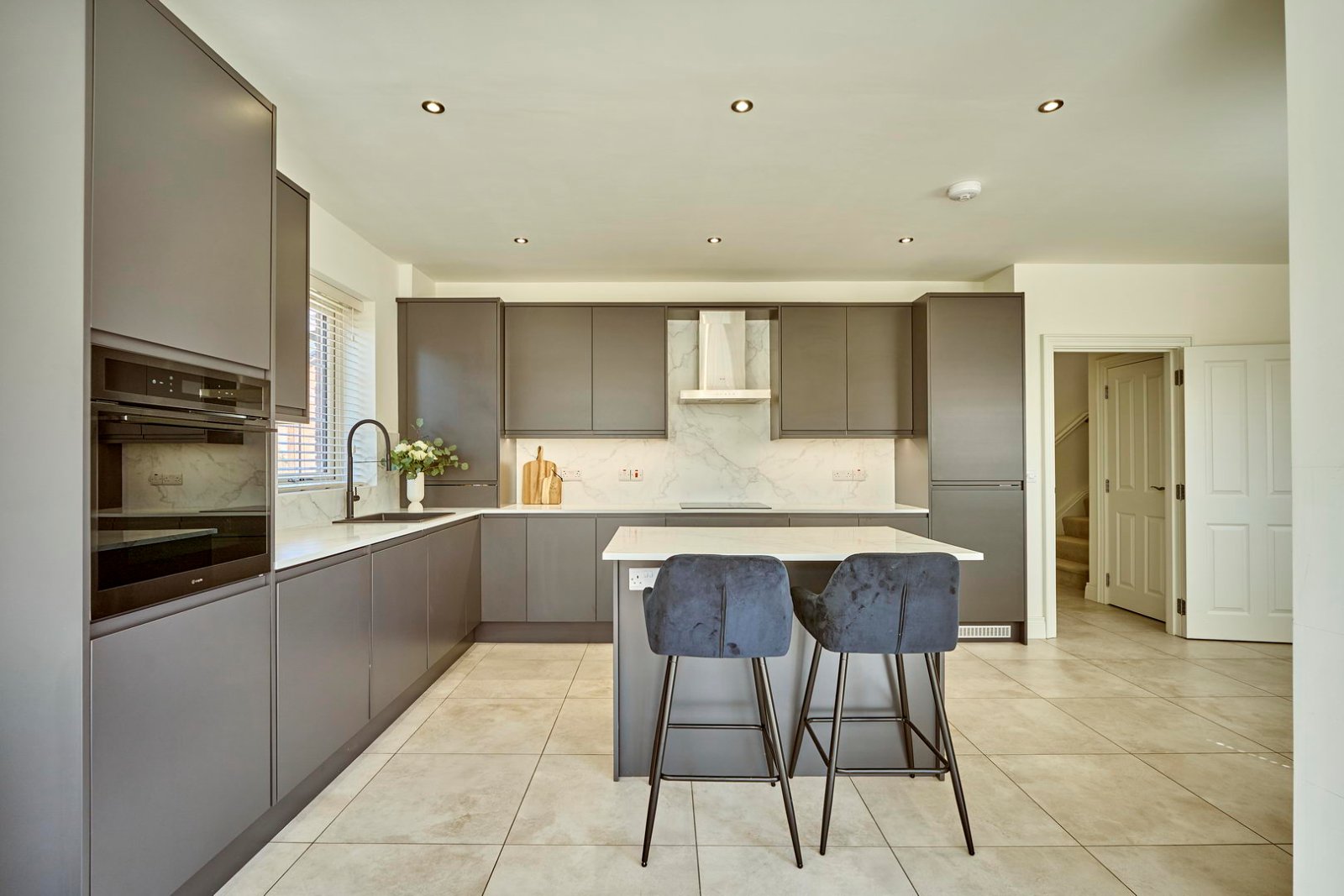 Step into a spacious living room, ideal for cosy evenings or entertaining family and friends. At the heart of the home lies a contemporary open-plan kitchen, complete with a central island, premium integrated appliances, and effortless flow into a bright dining and sunroom area with French doors to the garden - perfectly suited to modern family living. A convenient ground-floor WC adds to the list of features