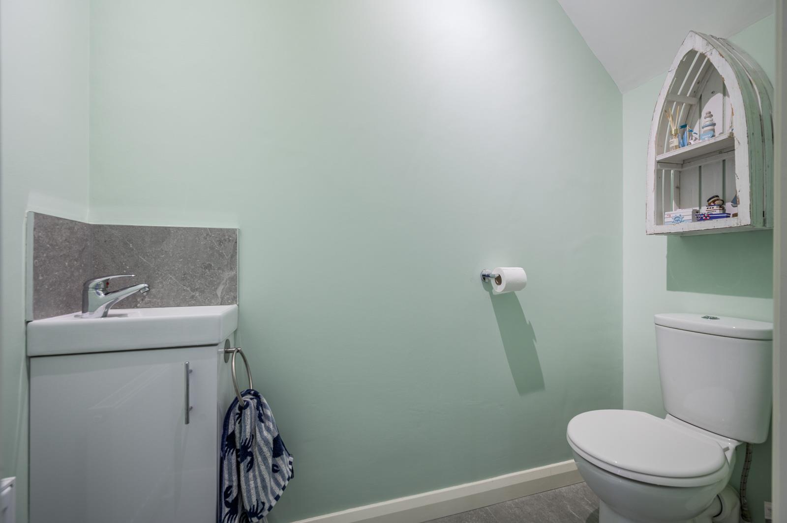 A white two-piece suite comprising a dual flush toilet and a wall-mounted wash hand basin. Finished with tiled flooring and neutral décor, it's a practical addition for guests and everyday family living.