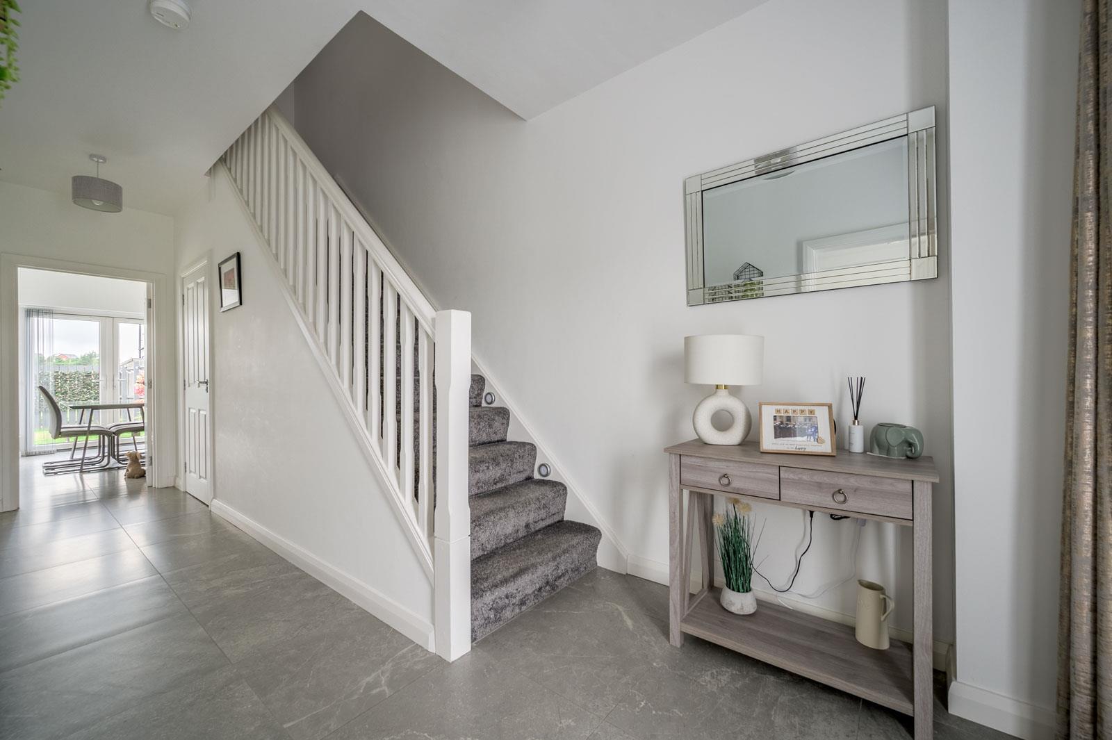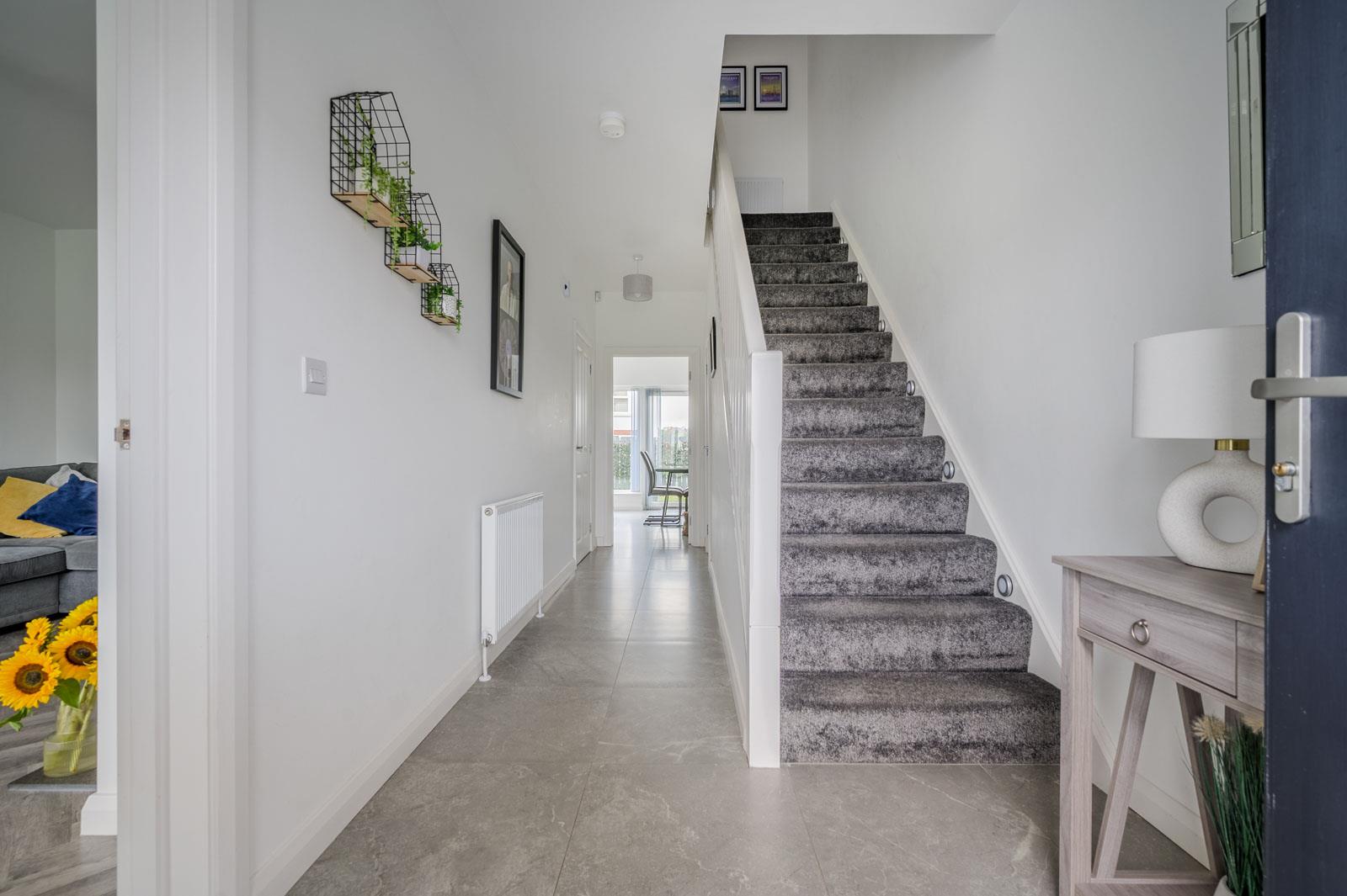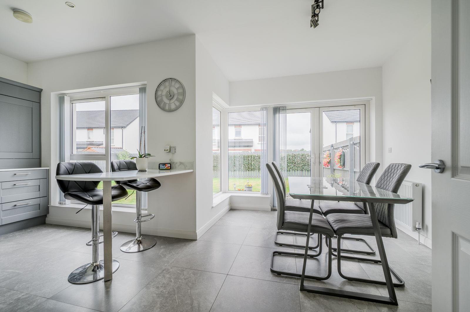 From the moment you step inside, the attention to detail is evident. The welcoming entrance hall leads to a generously sized lounge, complemented by a feature multi-fuel stove-ideal for cosy evenings and relaxed family time. To the rear, a bespoke open-plan kitchen and dining area forms the heart of the home, complete with sleek cabinetry, high-quality finishes, and double doors opening onto a sun-drenched, south-facing garden-perfect for entertaining or enjoying peaceful summer evenings.