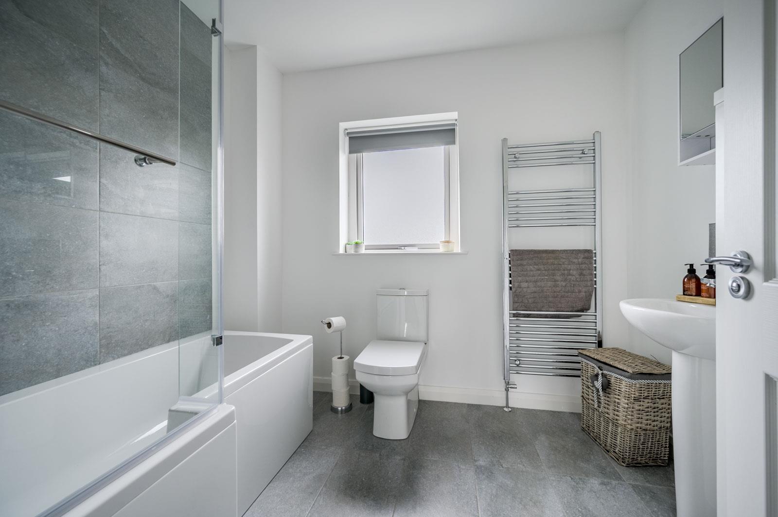 Stylish family bathroom comprising a modern three-piece suite, including a sleek toilet and wash hand basin, a shower bath with tiled surround, and a contemporary towel radiator for added comfort.