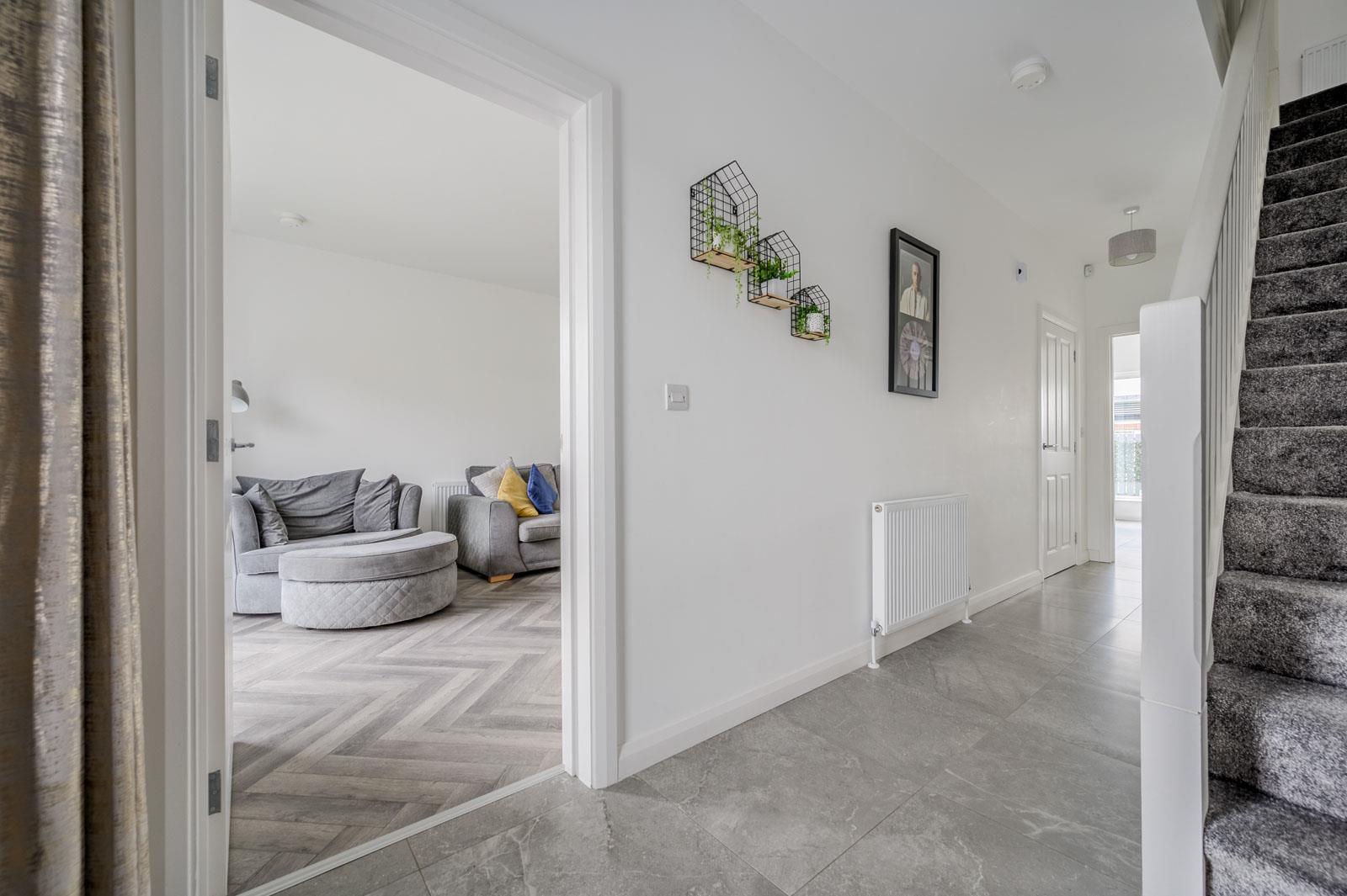 Ceramic tiles leading to a cloakroom and understairs WC.