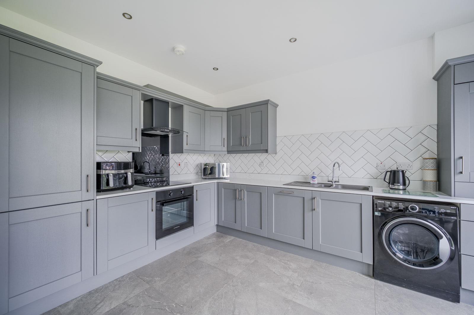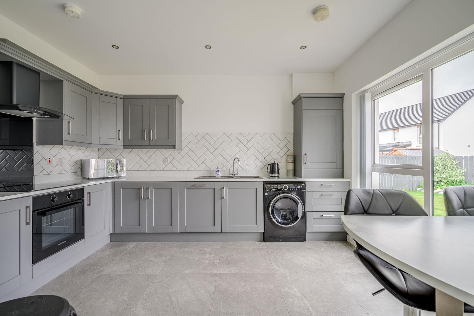 This beautifully designed contemporary kitchen boasts a bespoke layout with an excellent range of high and low-level units, complemented by durable laminate work surfaces and a grey composite sink with integrated drainer and mixer tap. Featuring an induction hob, integrated oven, and space for a washing machine, the kitchen is both stylish and practical. Tiled flooring adds a contemporary touch, while double doors open into the rear kitchen and provide easy access to the outdoor area. With ample space for dining and additional windows allowing natural light to pour in, the space feels bright, airy, and elegantly inviting.