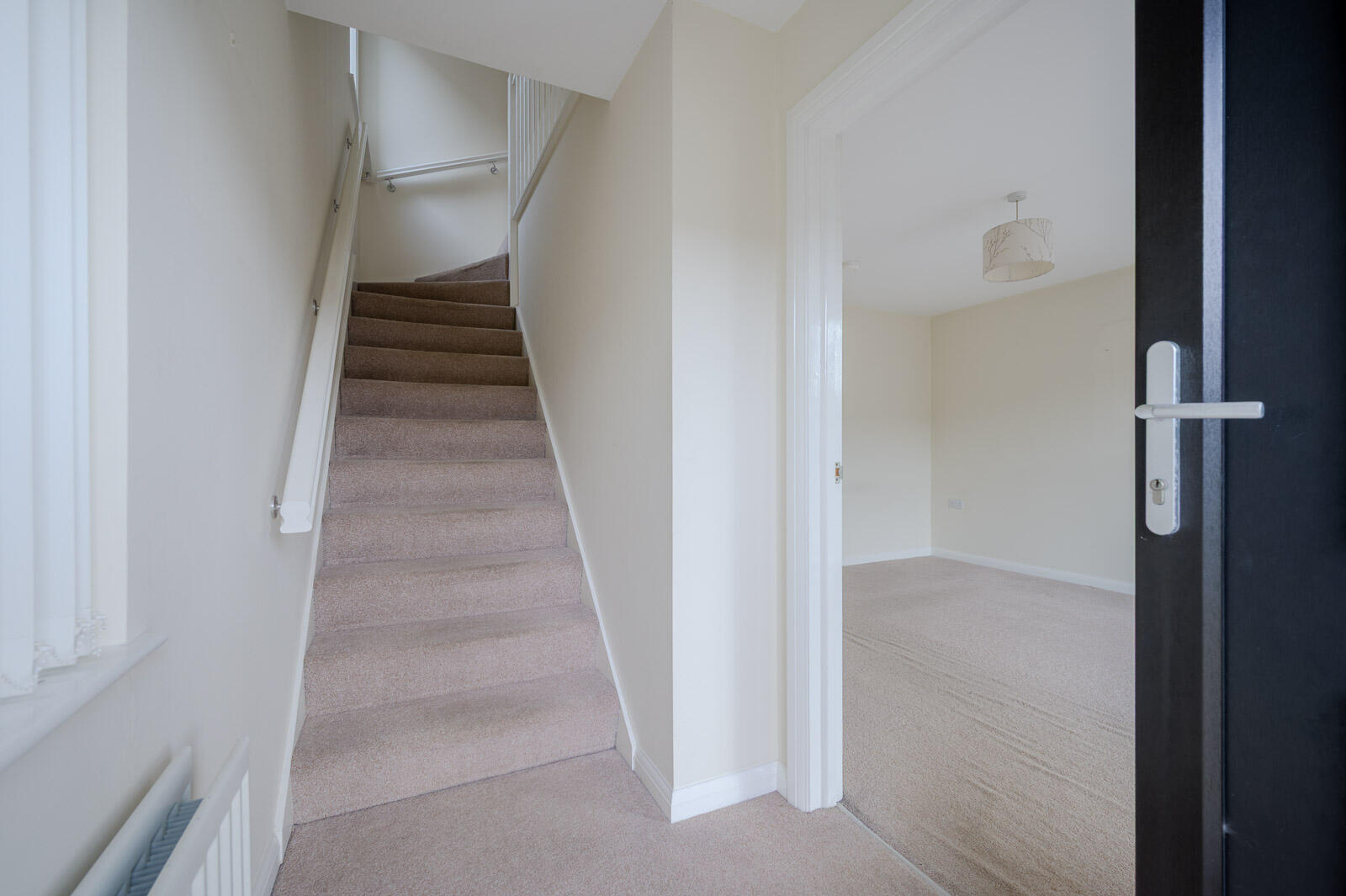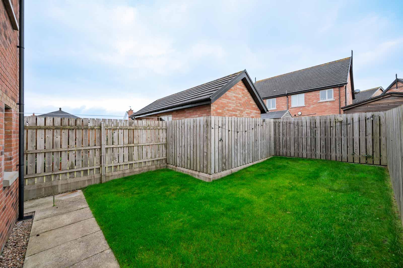 Driveway to front in loose stones with parking, fully enclosed rear garden in lawns.