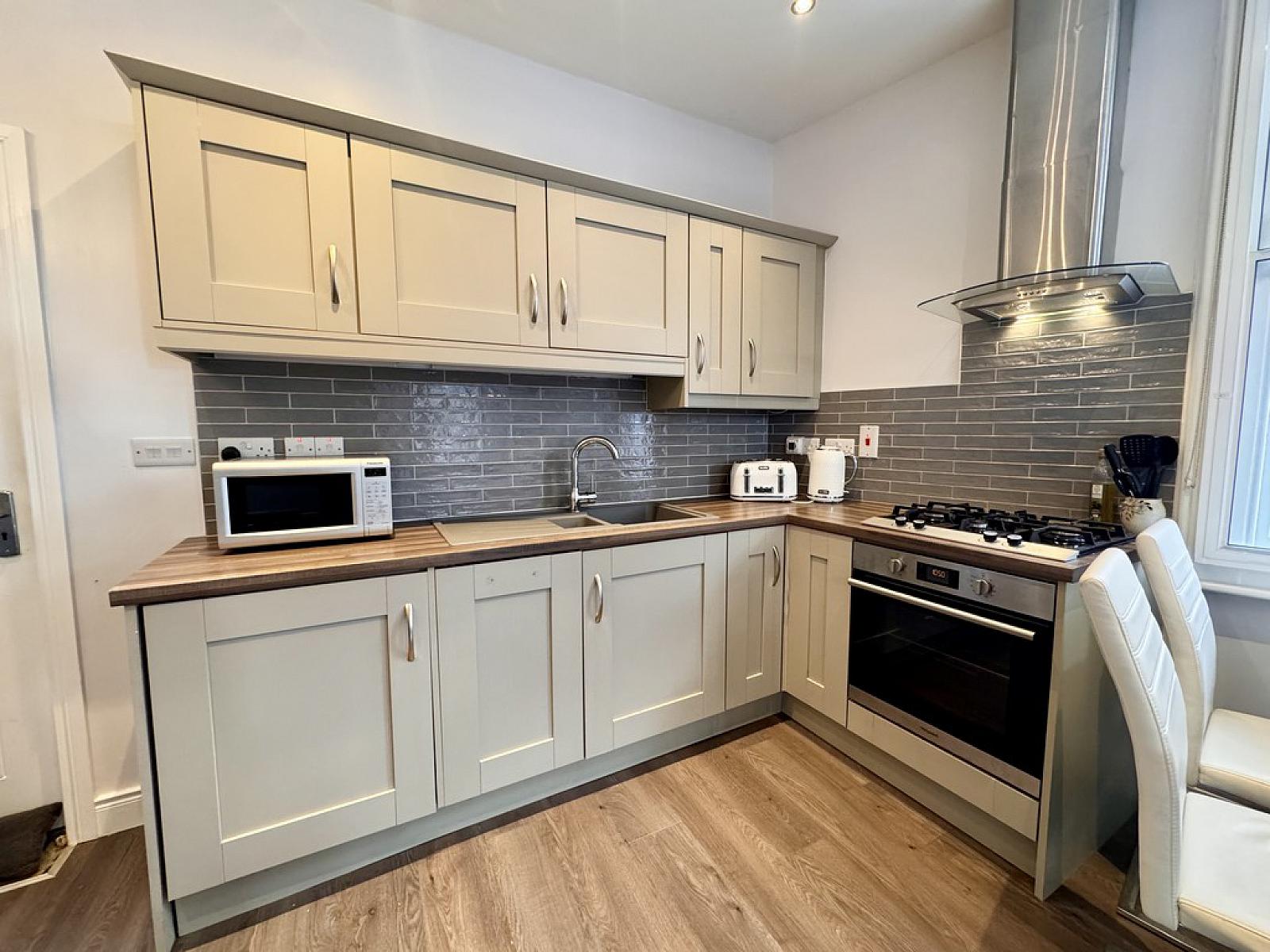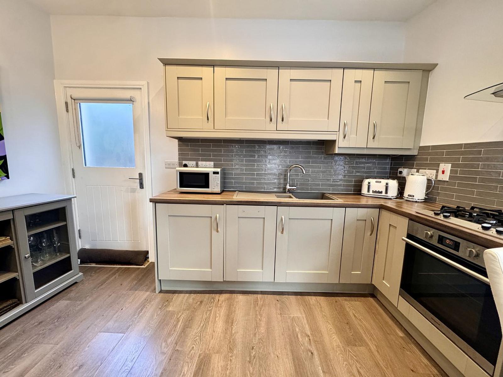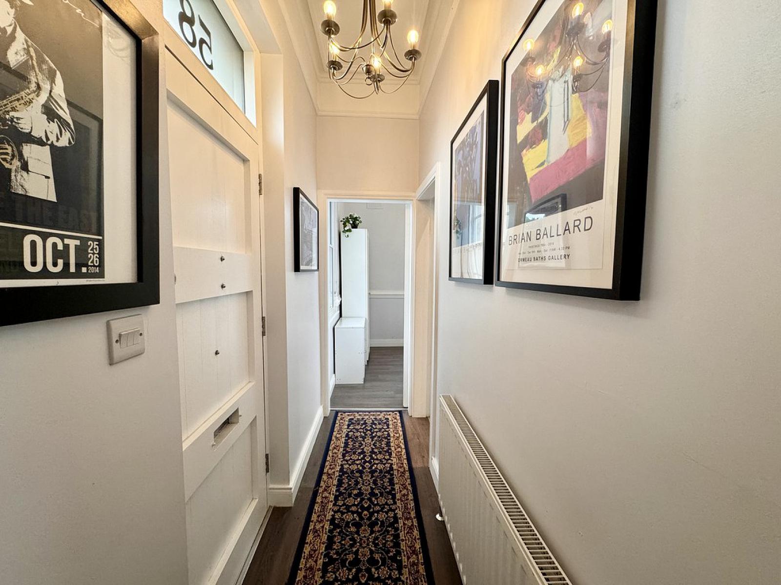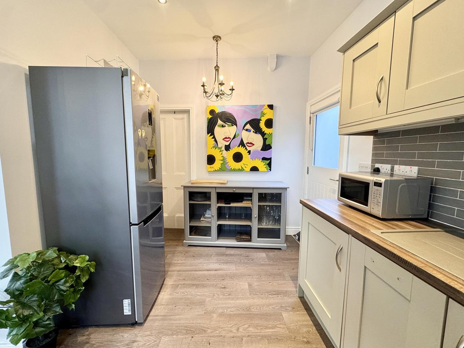 Internally, the hallway leads to the right into a spacious open-plan living, kitchen and dining area. The contemporary fitted kitchen is equipped with integrated appliances, including a washing machine and dishwasher. The inviting living area offers a cosy atmosphere, featuring a wall-mounted TV, corner sofa, dining table and chairs and a sideboard providing ample storage. There are two well-proportioned double bedrooms, each fitted with blackout blinds and a stylish bathroom complete with a walk-in shower unit, WC and vanity sink unit. Additional features include oil-fired heating, a driveway, a patio area and enhanced window glazing.