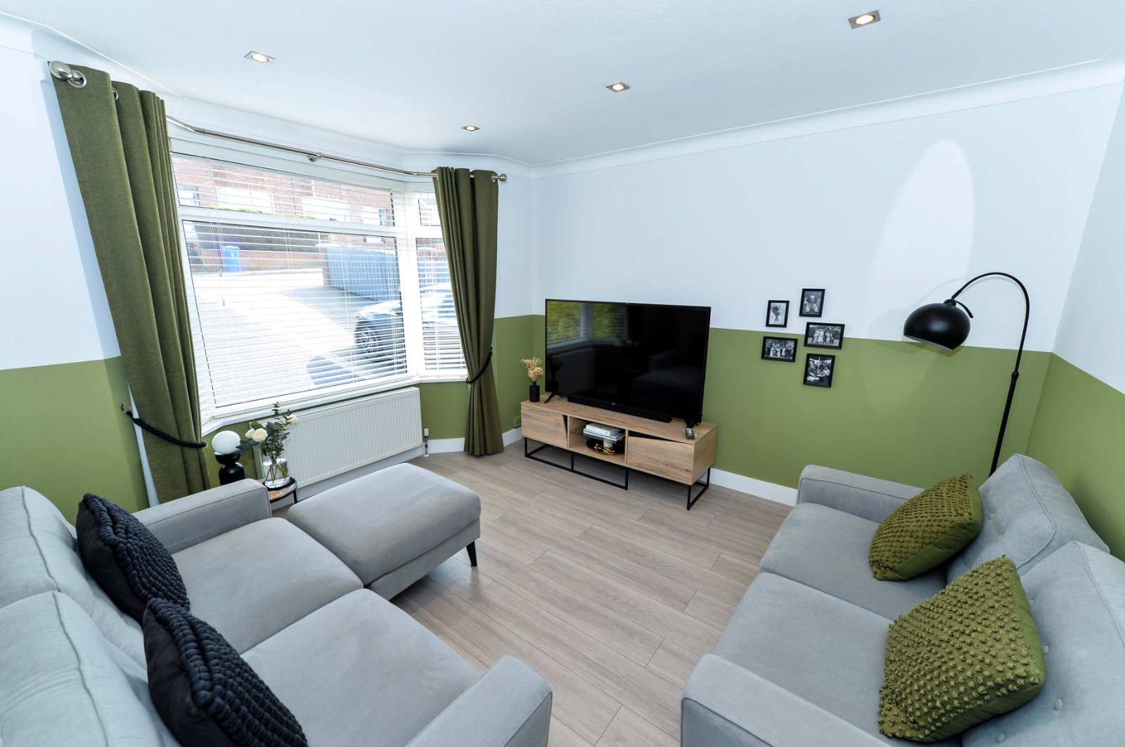 Bay window, laminate wooden floor, cornice work, recessed spotlights.