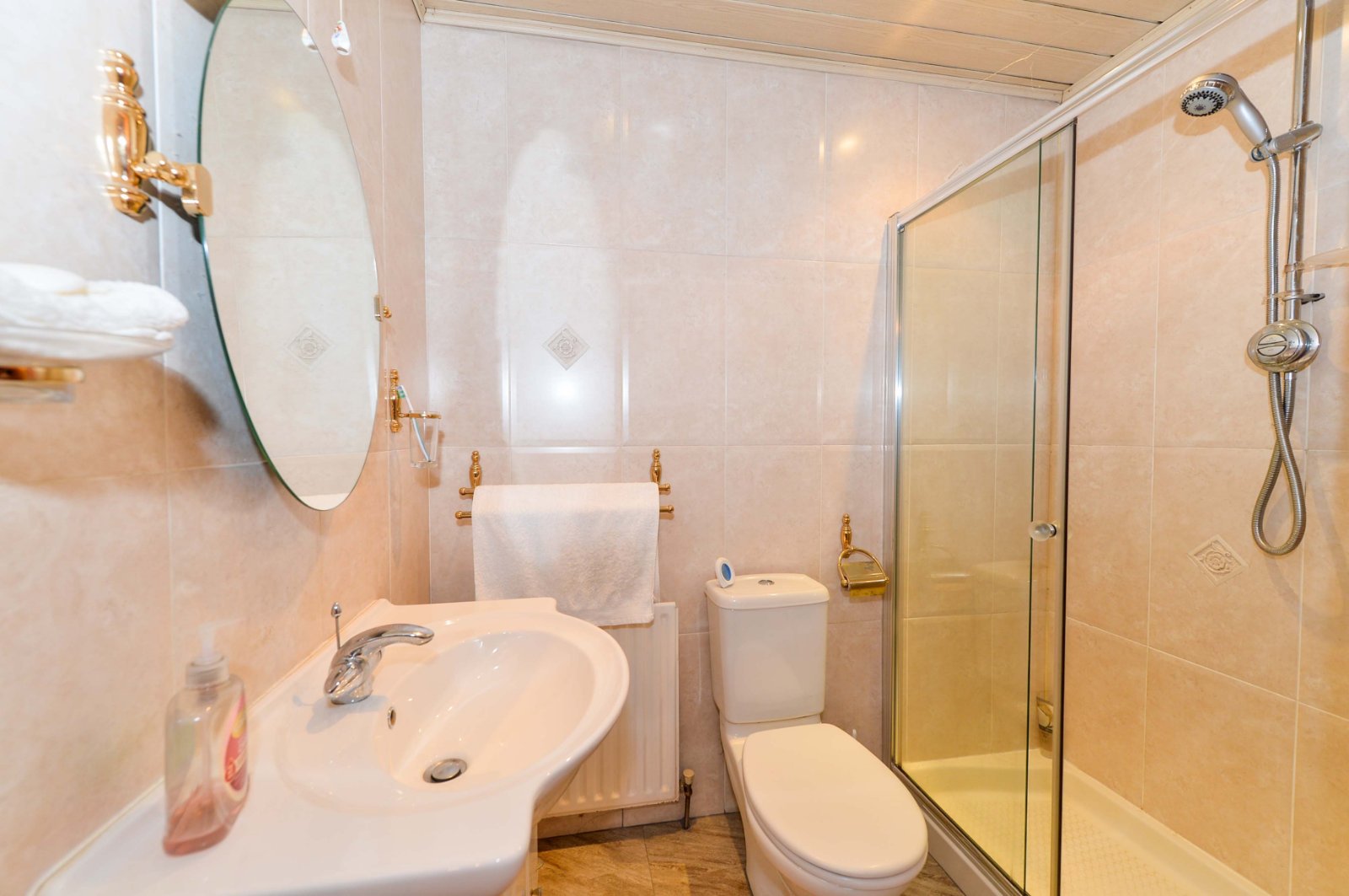 Fully tiled built in shower cubicle with Mira electric shower unit, dual flush close coupled WC, vanity unit with mixer taps, tongue and groove ceiling with recessed spotlights, ceramic tiled floor, fully tiled walls.