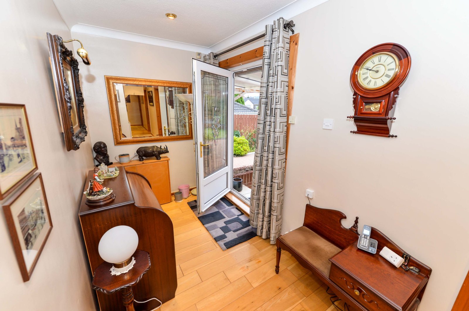 Covered porch, uPVC double glazed front door and double glazed side panel to entrance hall, solid wooden floor, cornice work, recessed spotlights, alarm panel, airing cupboard, access to roof space.