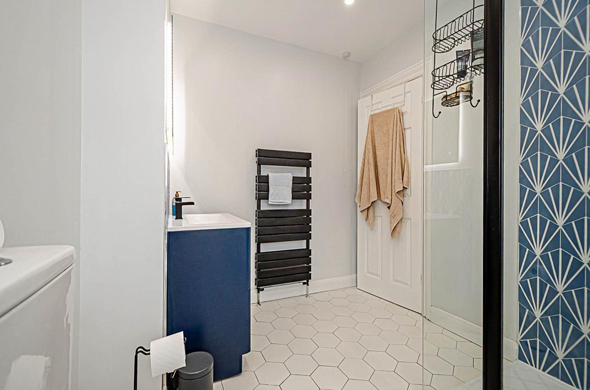 Large walk in shower enclosure with black thermostatic shower, dual shower heads, wash hand basin in navy two drawer vanity with black mixer tap, W.C., decorative wall tiling, black towel rail radiator, LED mirror and recessed spotlights