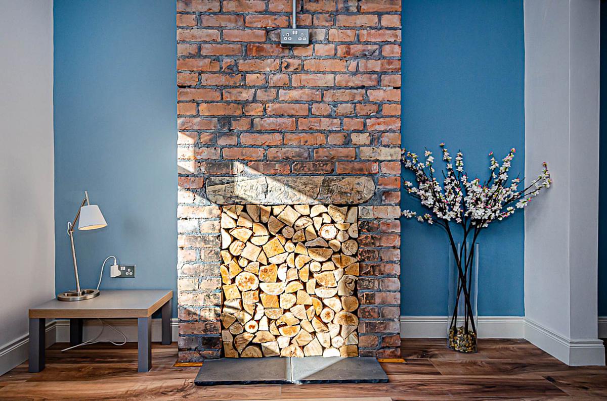 Reclaimed brick chimney breast, timber laminate floor, French doors, and open to..