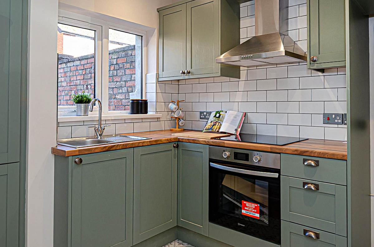 Newly fitted range of high and low level fitted units, electric oven, ceramic hob, stainless steel extractor canopy, stainless steel sink, recess for fridge freezer, gas boiler in cupboard, part tiled walls and decorative ceramic tiled floor