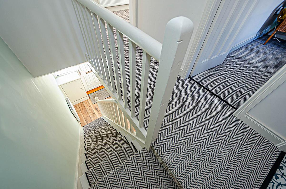 Storage under stairs with plumbing for washing machine, timber laminate floor and stair runner