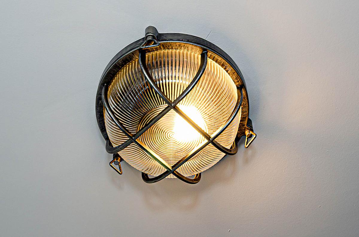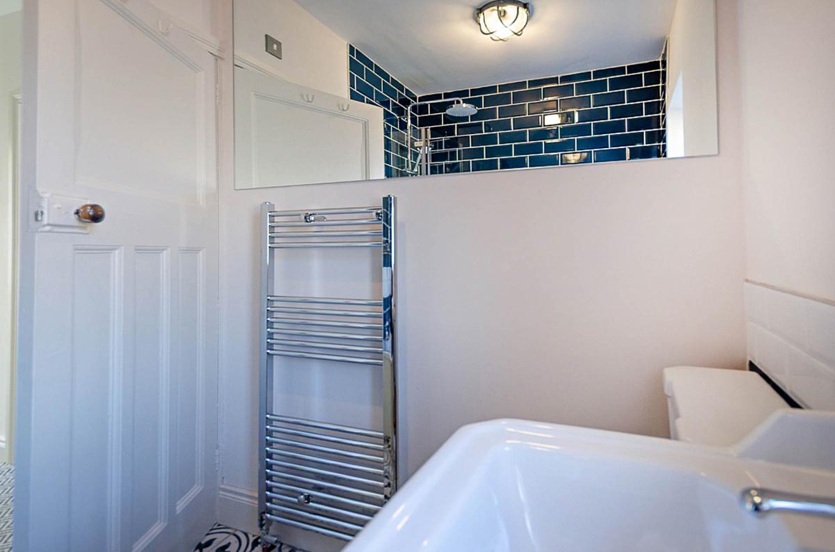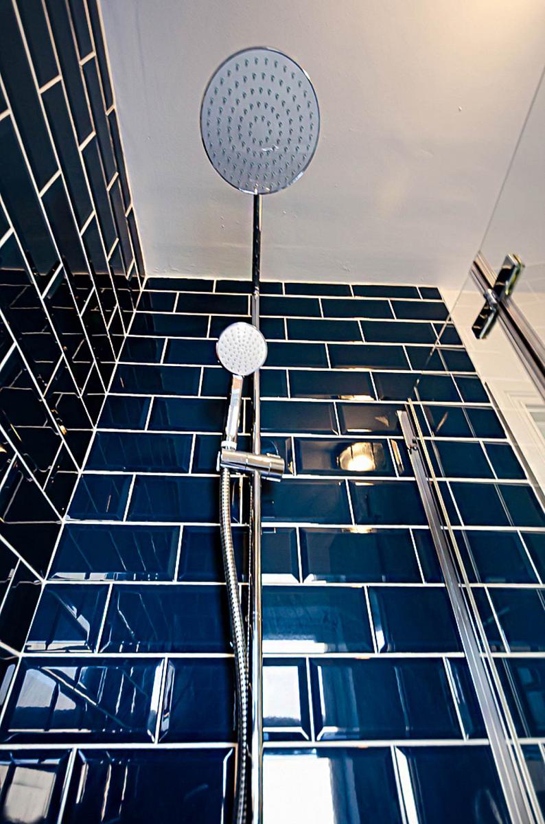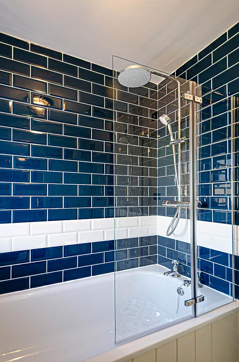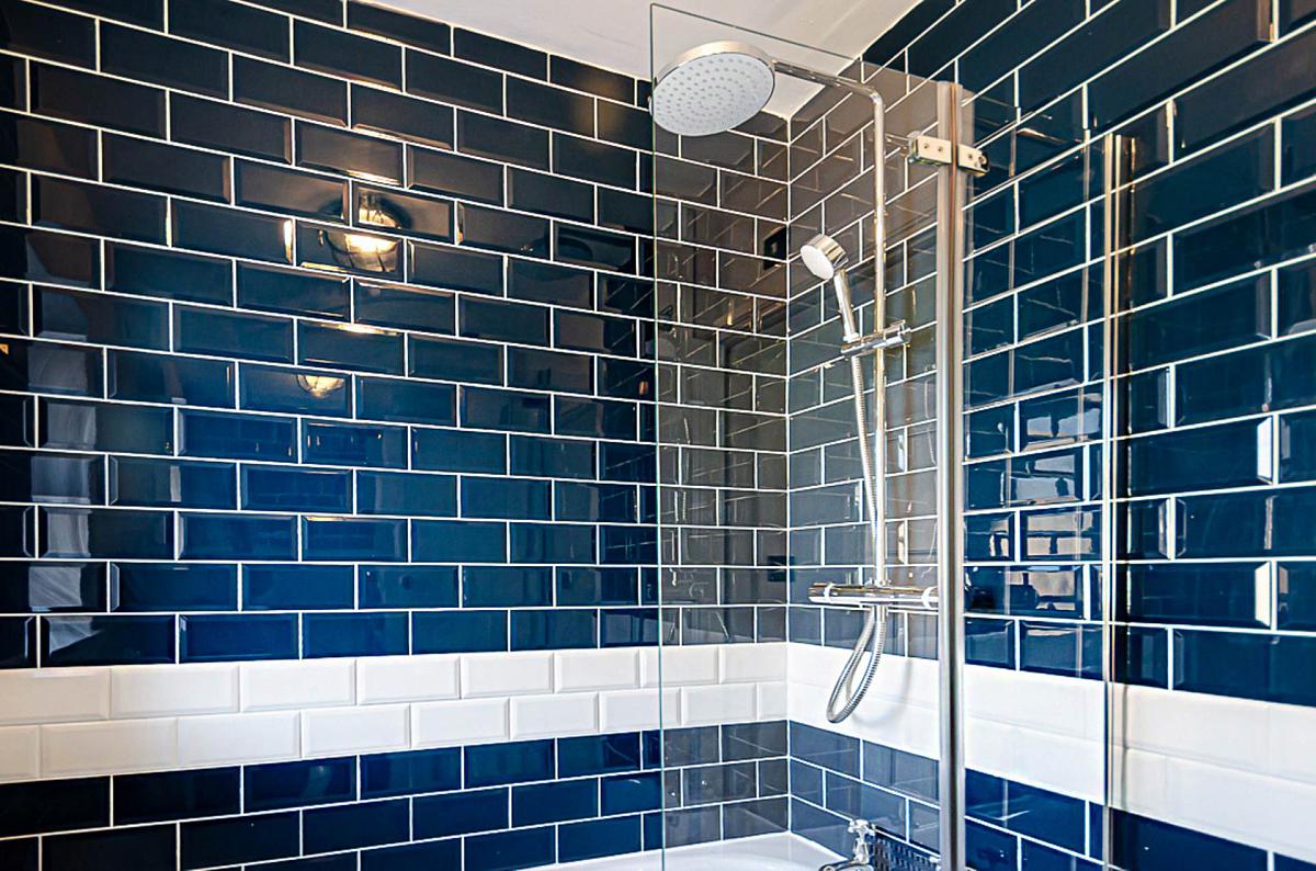 Traditional style bathroom - bath with thermostatic shower, dual shower heads, and screen, pedestal wash hand basin, W.C., part tiled walls in navy and white, chrome towel rail radiator, and antique style light