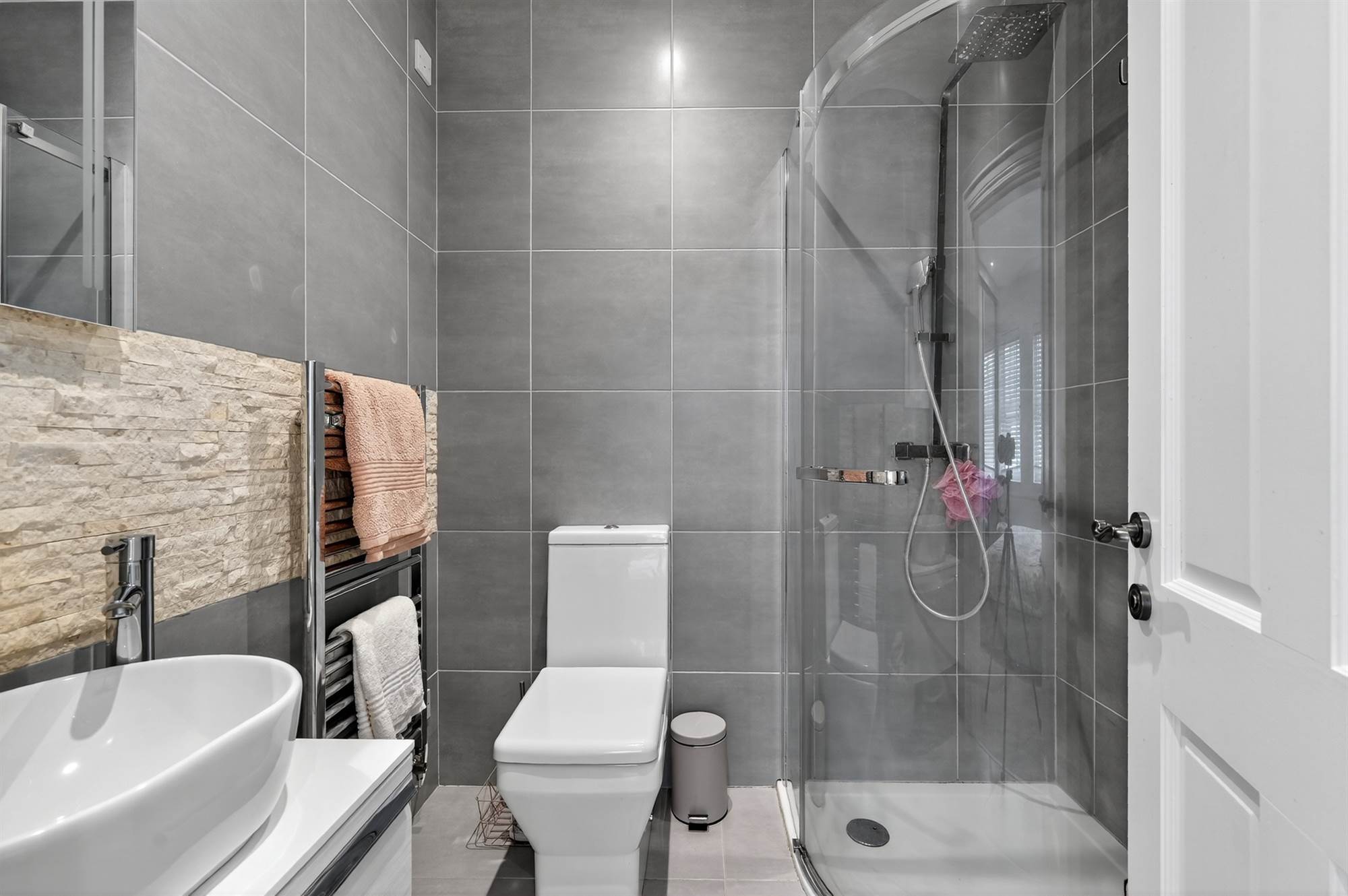 White suite comprising low flush WC with push button, floating wash hand basin with chrome mixer tap and built in vanity unit, corner shower unit with sliding door, shower with thermostatic control valve and telephone attachment, fully tiled walls, heated tiled floor, chrome heated towel rail, frosted glass window, low voltage recessed spotlighting, extractor fan.