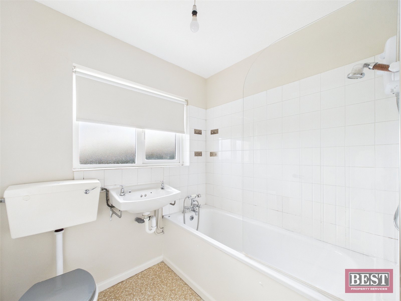 Upstairs, the landing is carpeted and provides access to the roofspace. The family bathroom, located to the rear, includes a white suite comprising WC, wash hand basin, and bath with electric shower and shower screen, complemented by partial wall tiling. The three bedrooms are all equipped with built-in wardrobes, with Bedroom 1 positioned to the rear and Bedrooms 2 and 3 to the front.