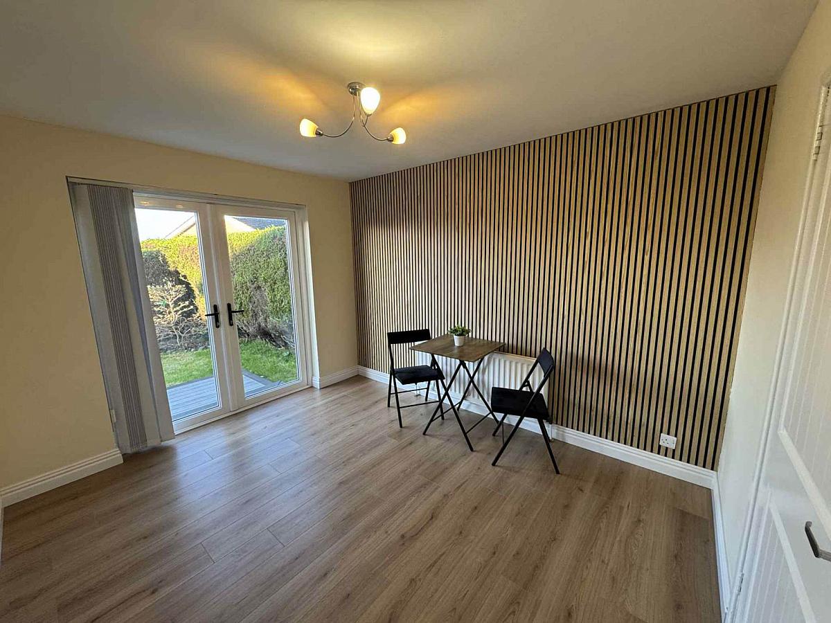 Dining room with feature panelling on wall and UPVC patio doors to garden