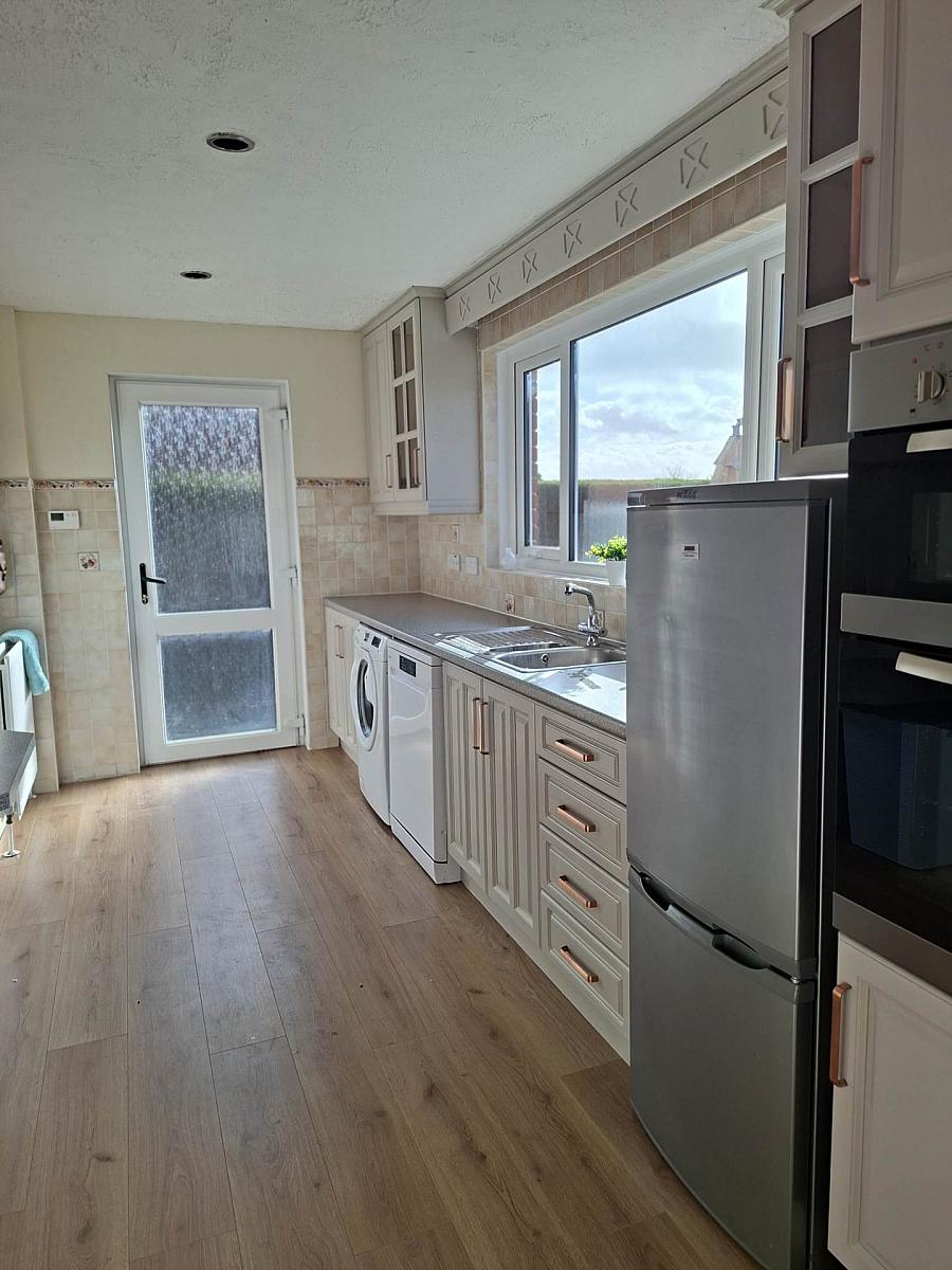 Single drainer stainless steel sink unit with vegetable basin and mixer tap. Excellent range of high and low level units and glazed display cabinets. Laminate worktops. Built in double oven and 4 ring gas hob. built in extractor fan. Plumbed for dishwasher and washing machine. Wood strip laminate flooring, part tiled walls. UPVC double glazed door to the garden.