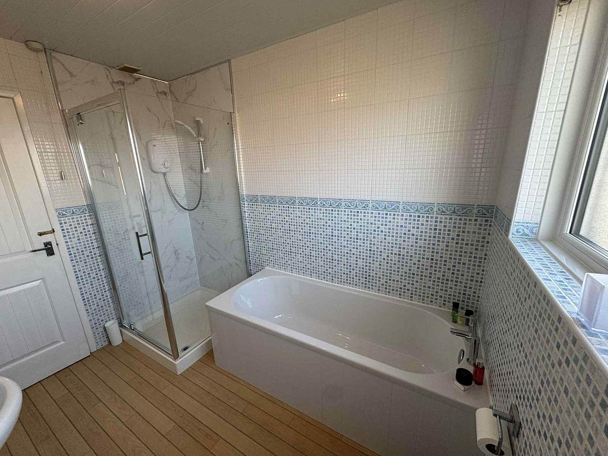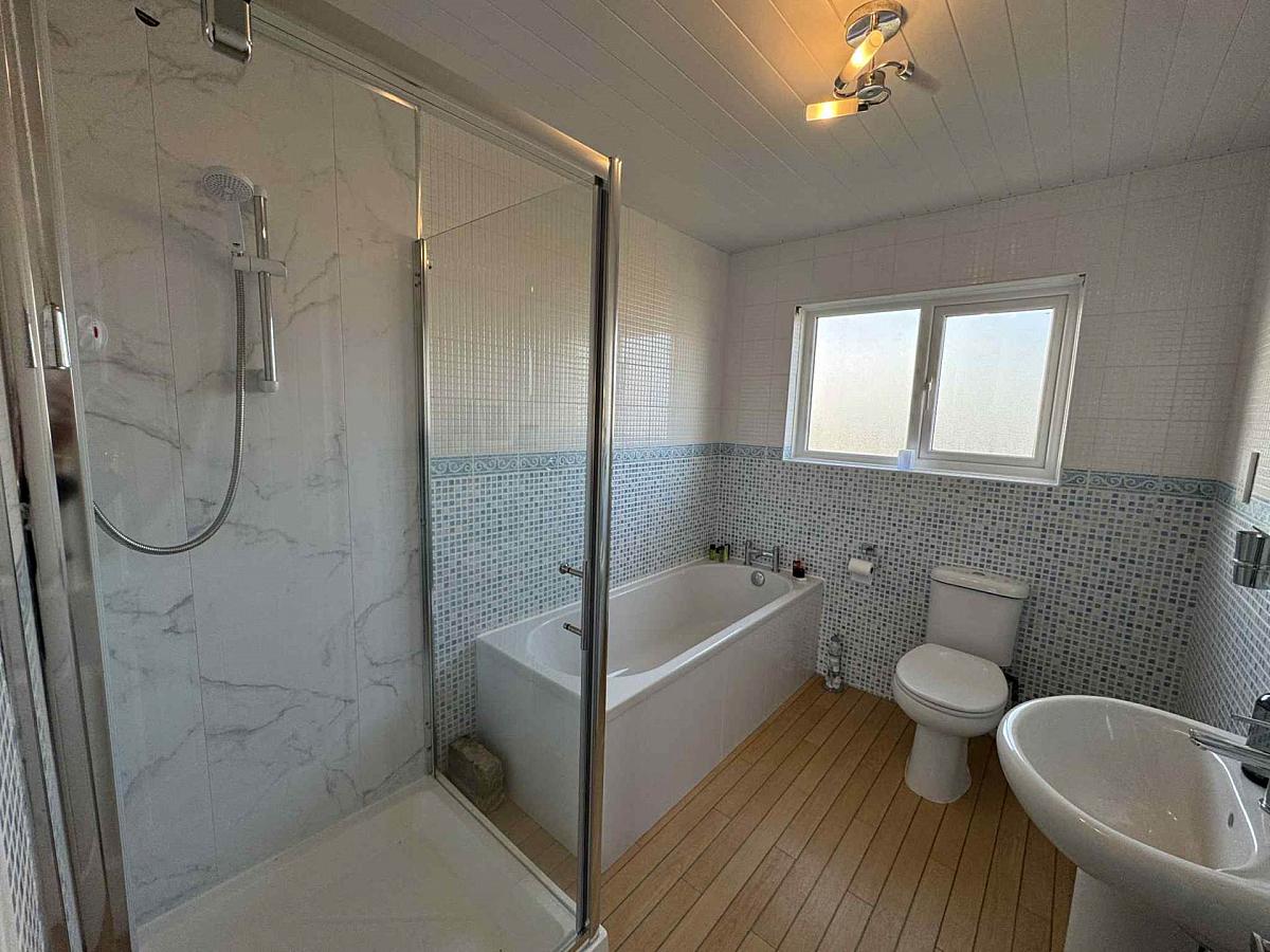 White suite comprising panelled bath with chrome mixer taps. Low flush WC. Pedestal wash hand basin with mixer tap. Fully tiled walls. Chrome & glass shower enclosure with cladded walls and mira electric shower.