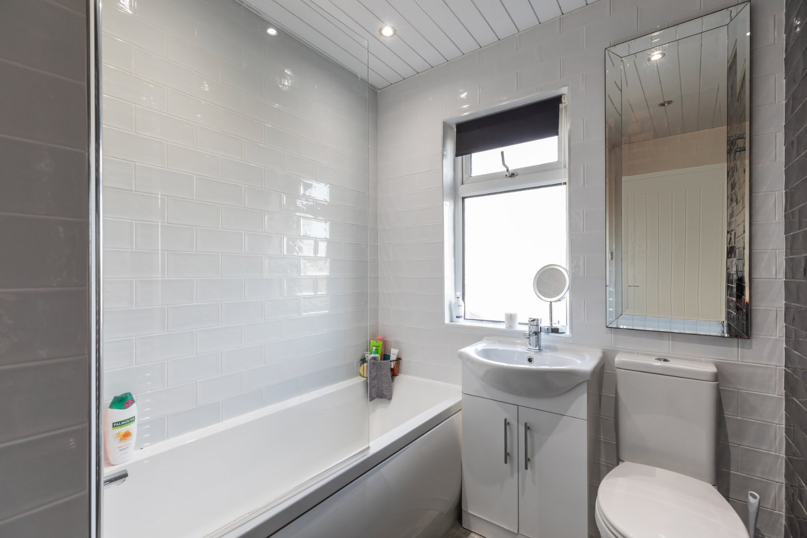 Modern white suite comprising panelled bath with shower above, WC and wash hand basin. Airing cupboard with gas boiler