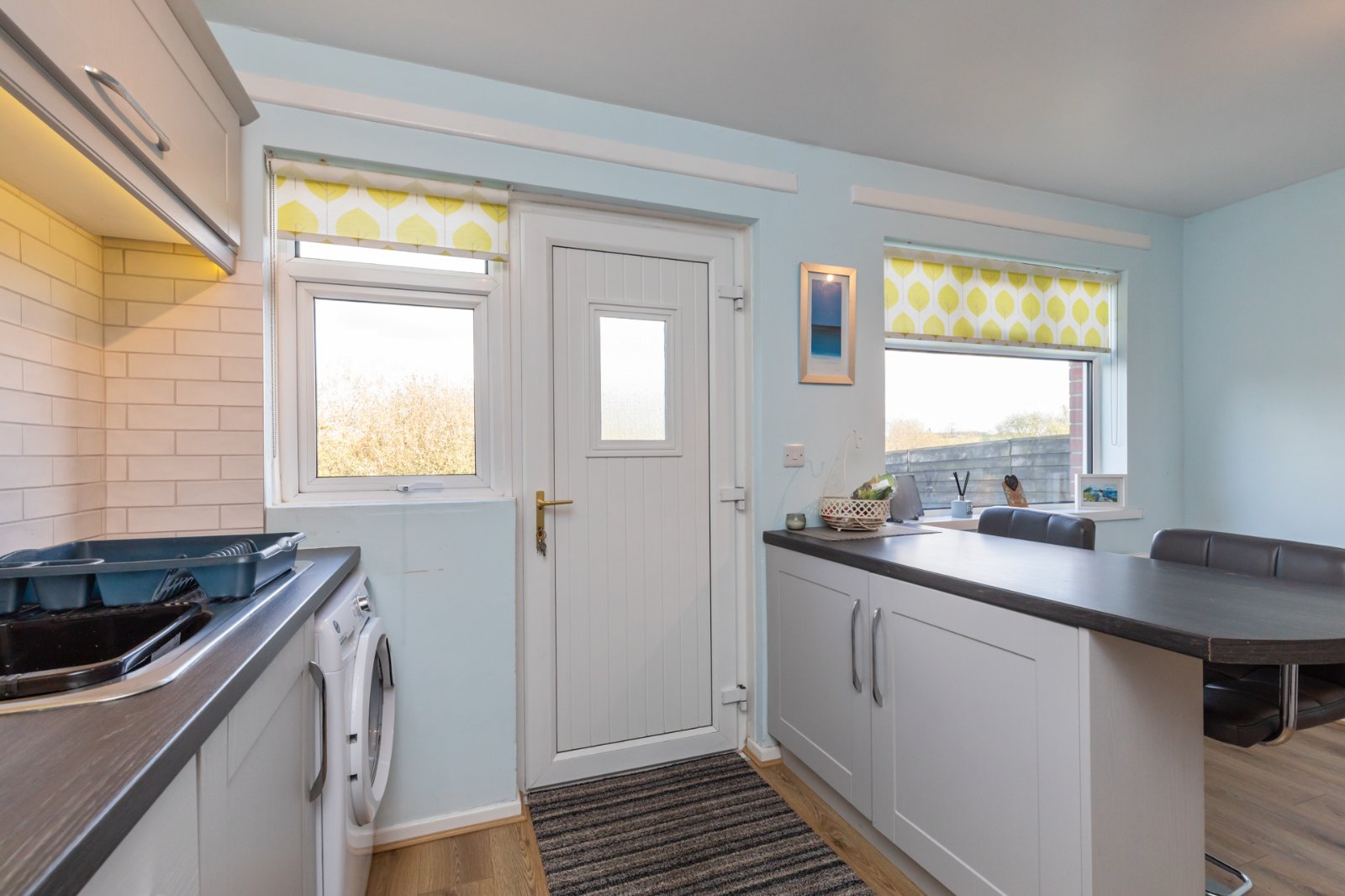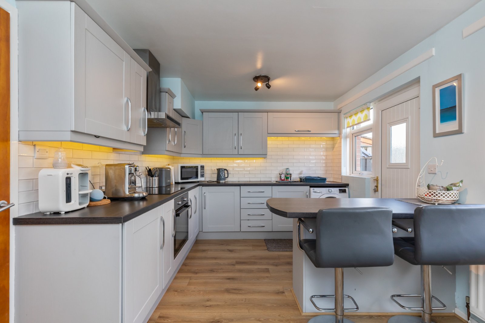 Modern fitted kitchen with range of integrated appliances, work surfaces, sink unit, dining area and access to rear.