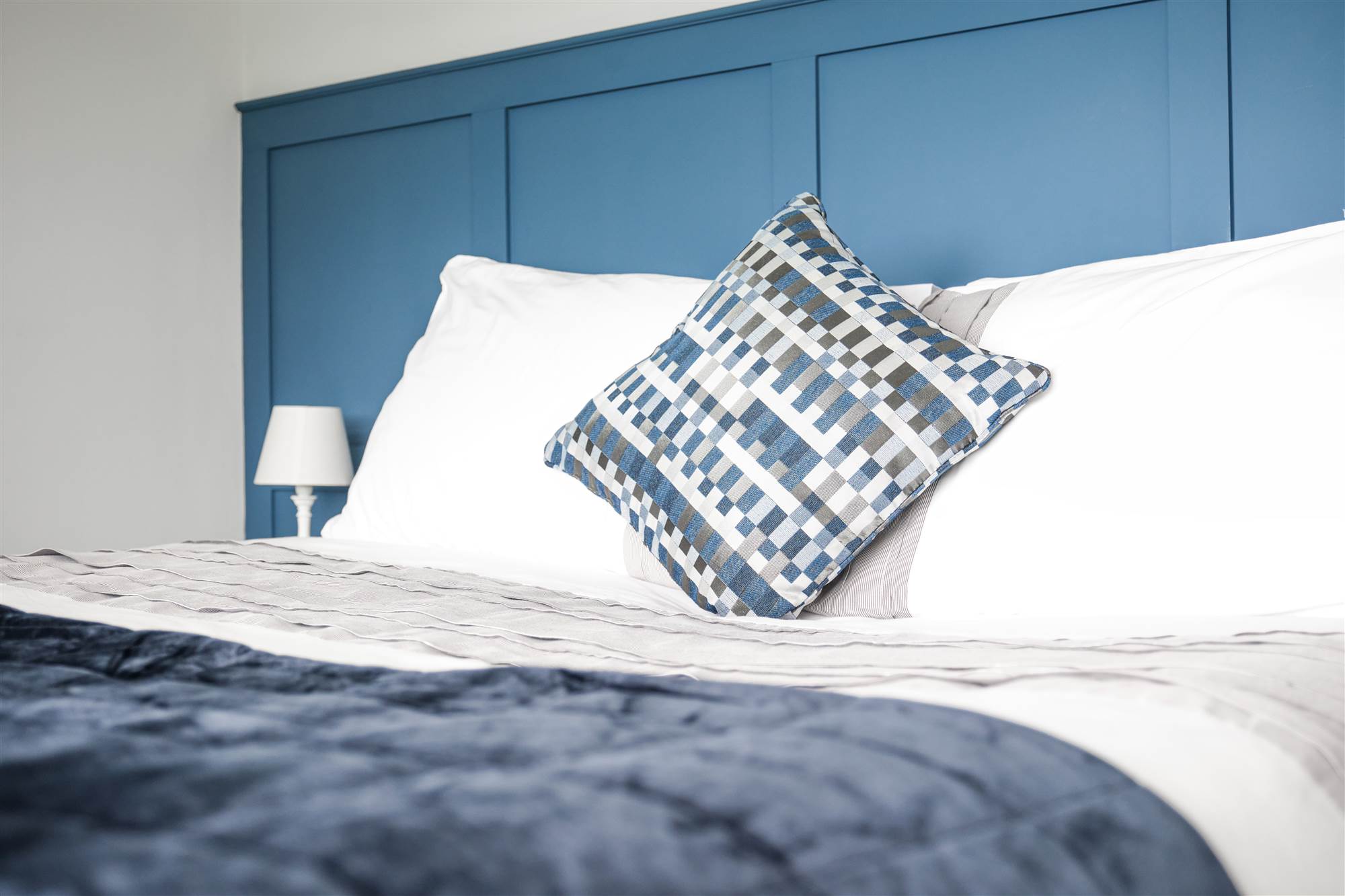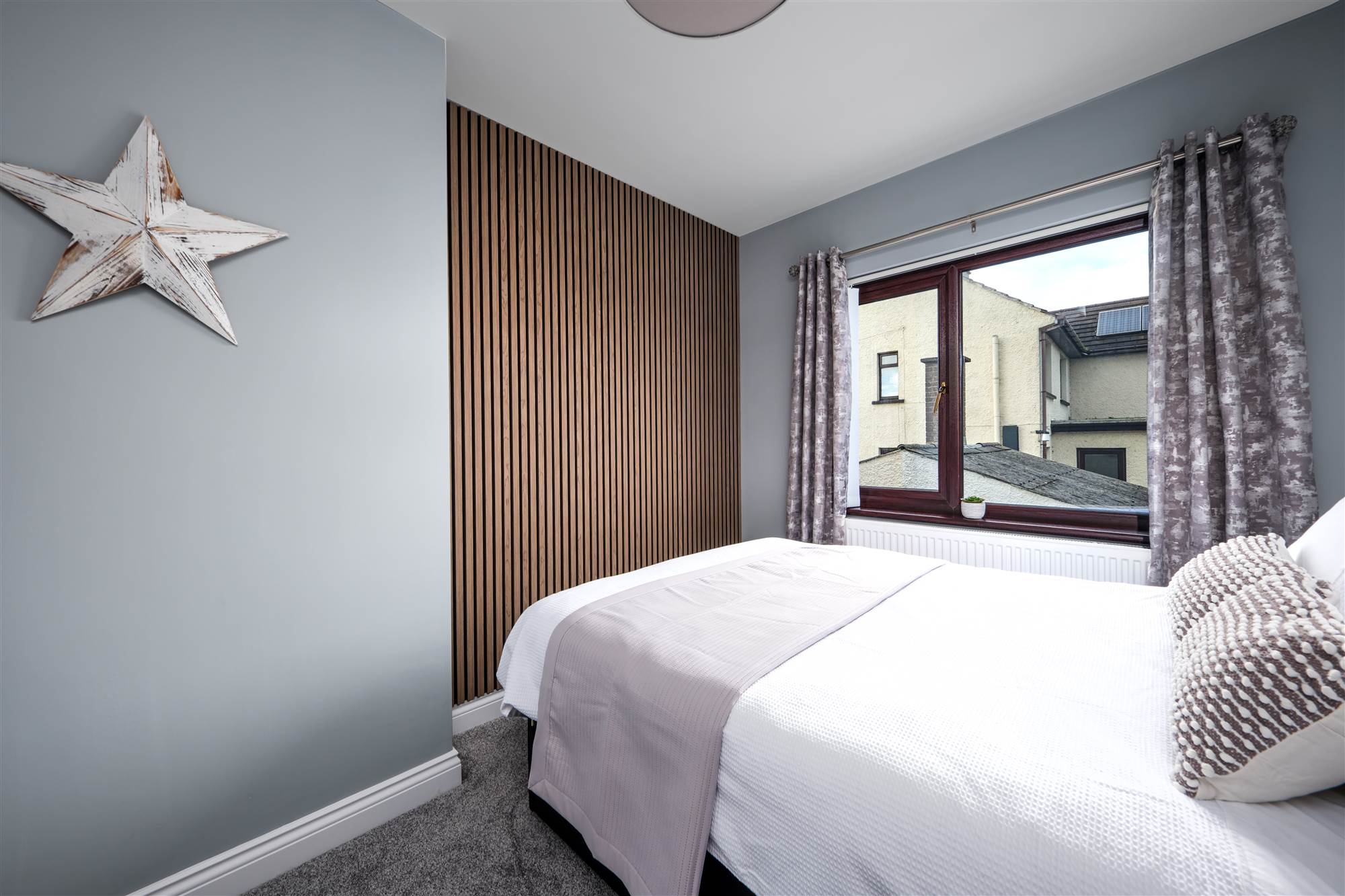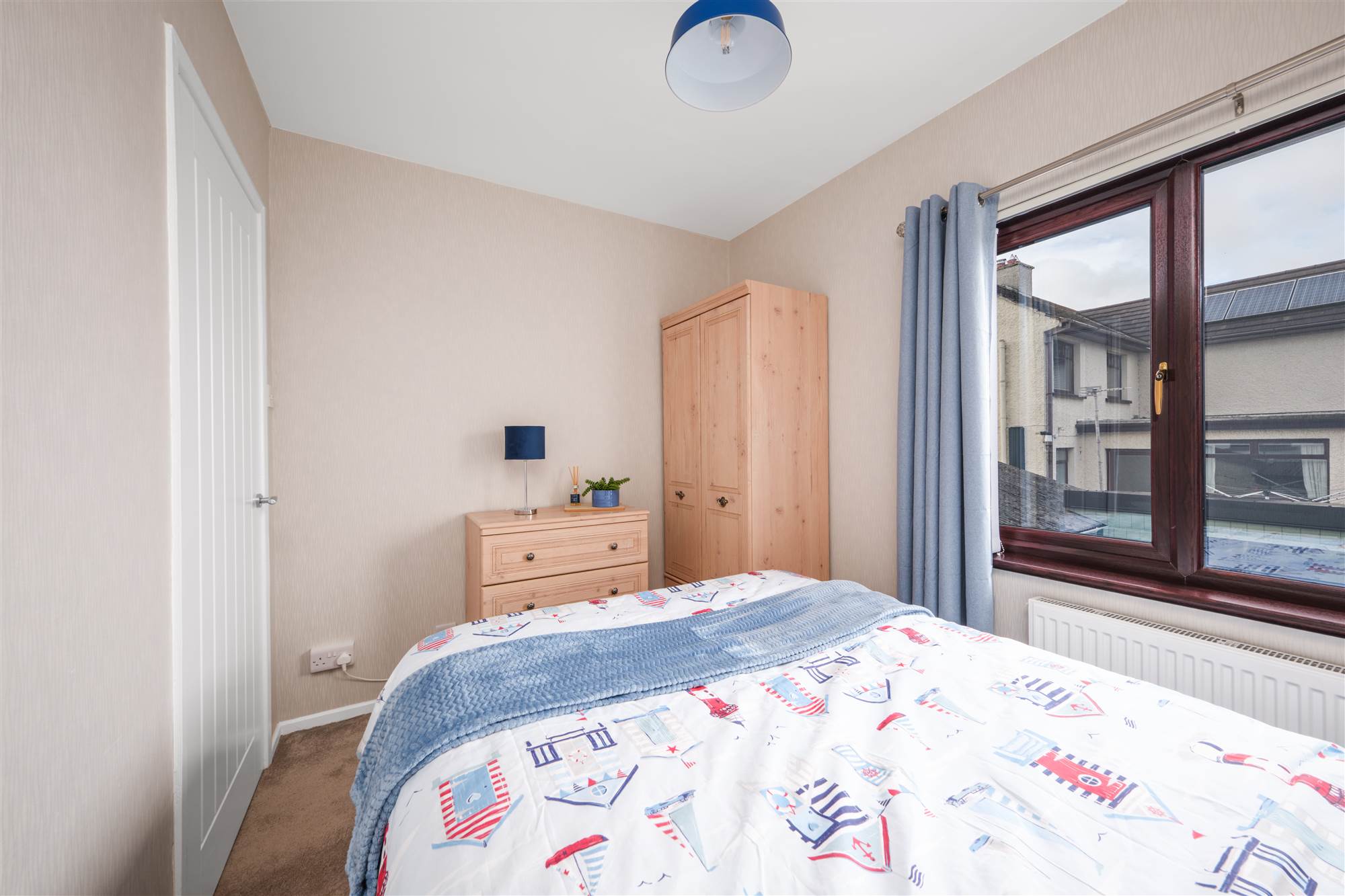 With built in double wardrobes, drawers and part panel walls.