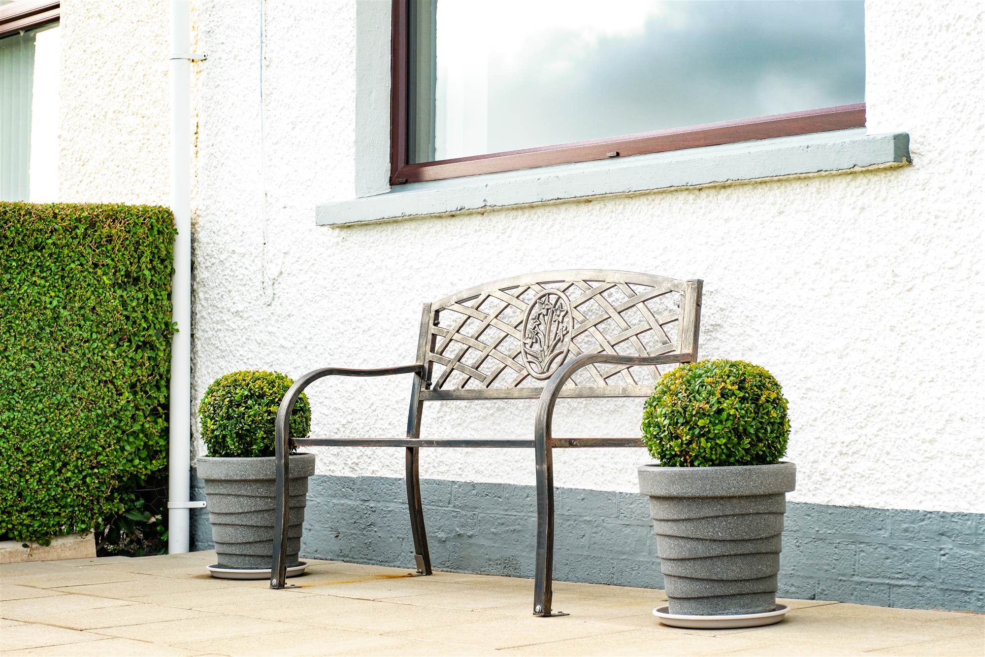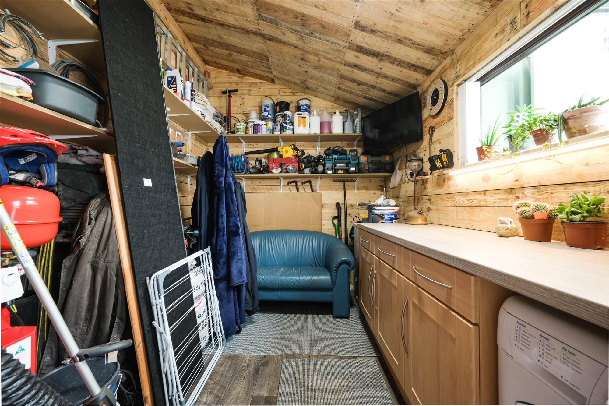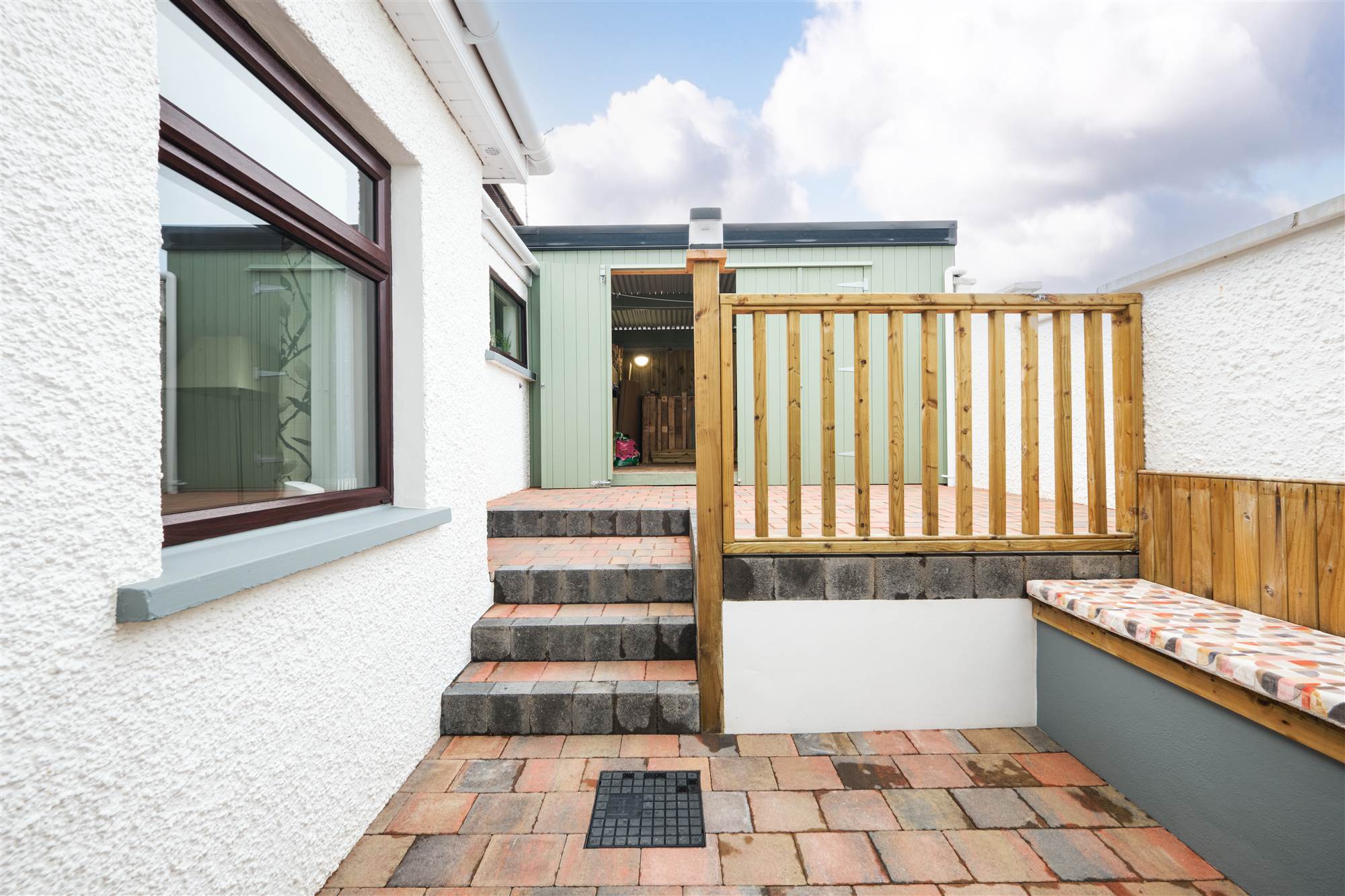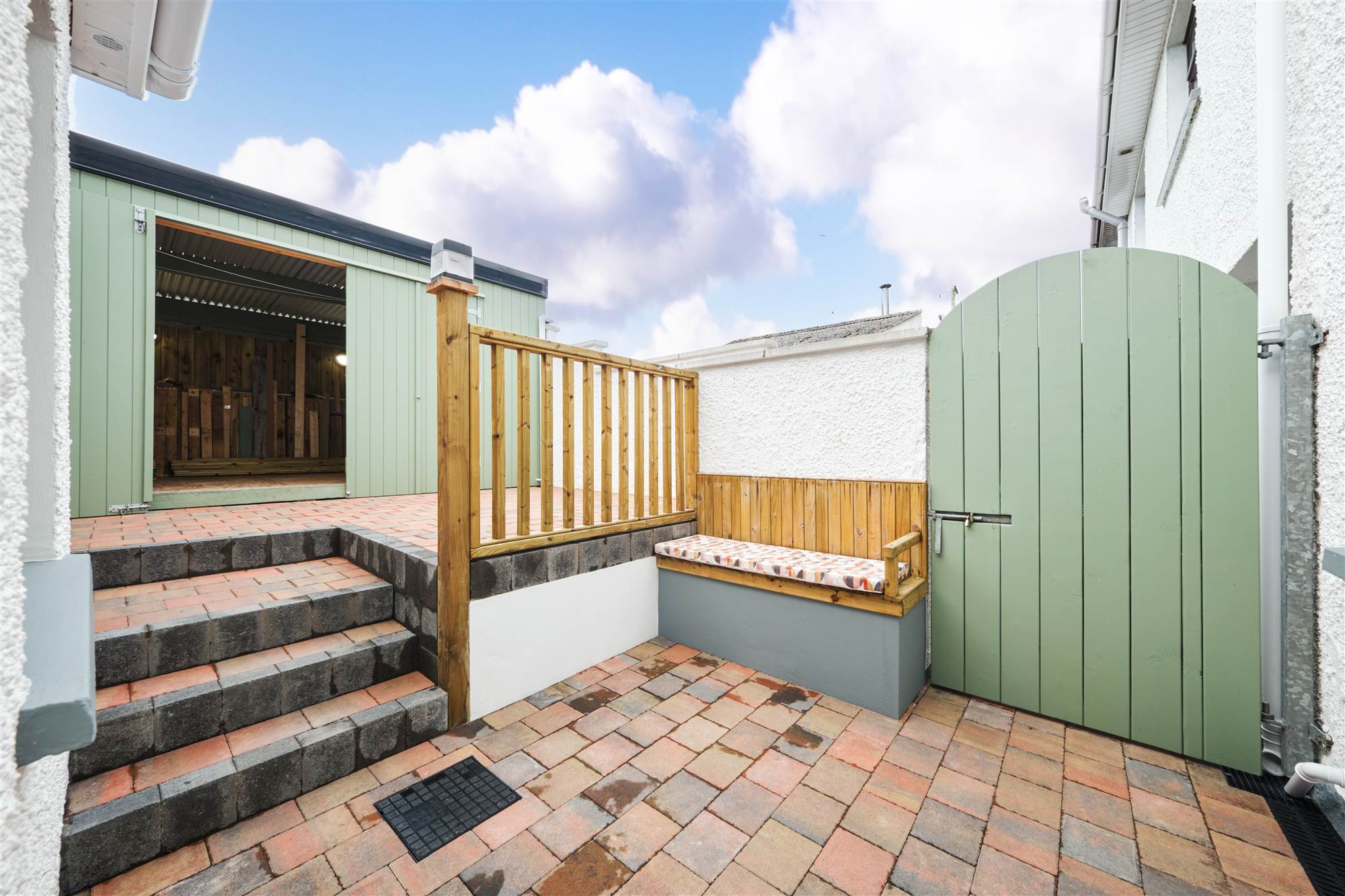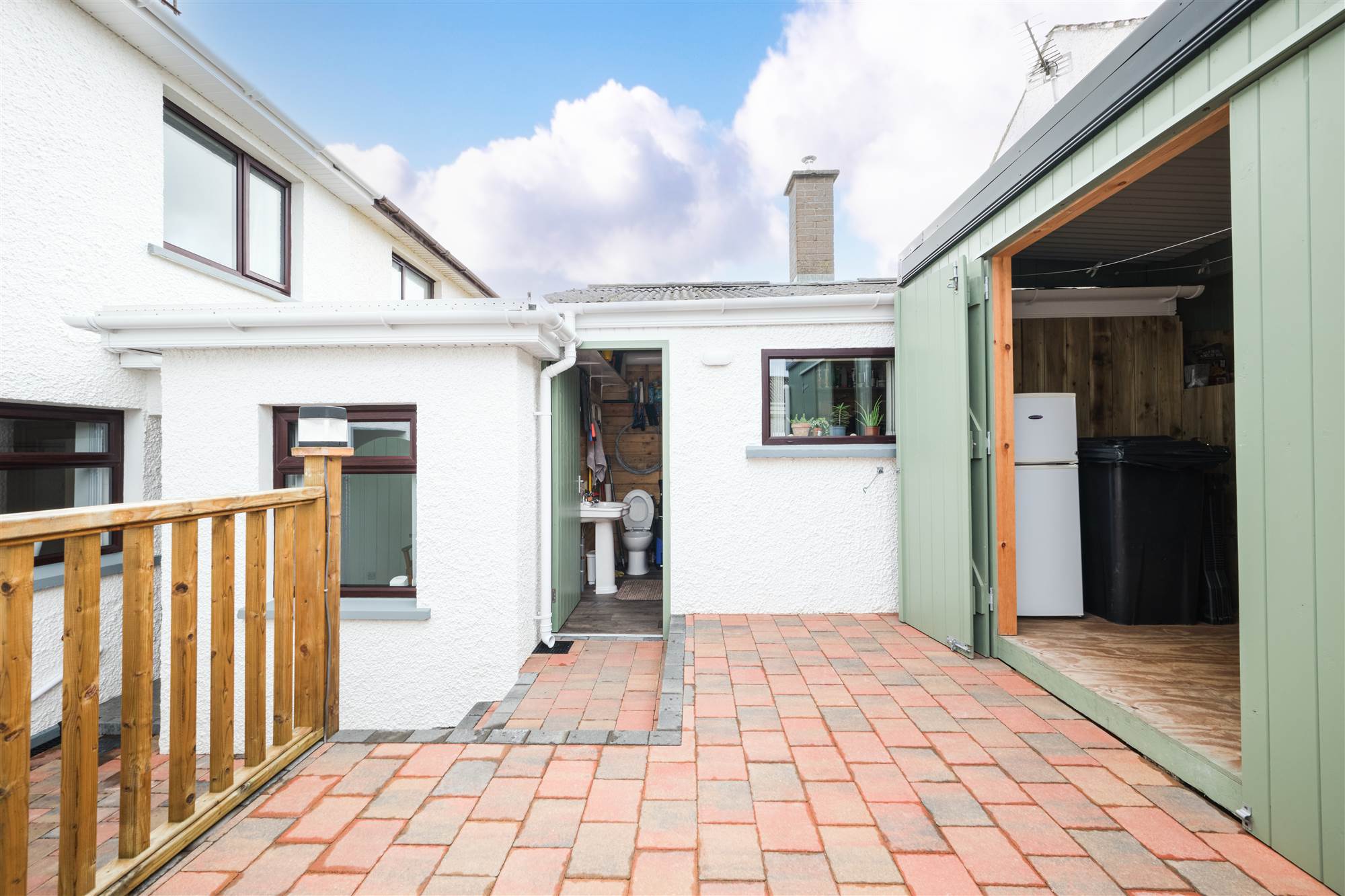 Shared paved path to front with shared access to rear of property. Garden to front is laid in lawn surrounded by hedging with paved patio area. Garden to rear is fully enclosed and fully paved with built in wooden seat with paved steps leading to additional elevated patio area. Access to shed 13"2 x 7"10 with low level units, plumbed for automatic washing machine, boiler, separate w.c., wash hand basin with tiled splashback, light and power points. Additional storage with double fold doors 13"3 x 10"5 with light and power points. Tap to rear. Light to front and rear.