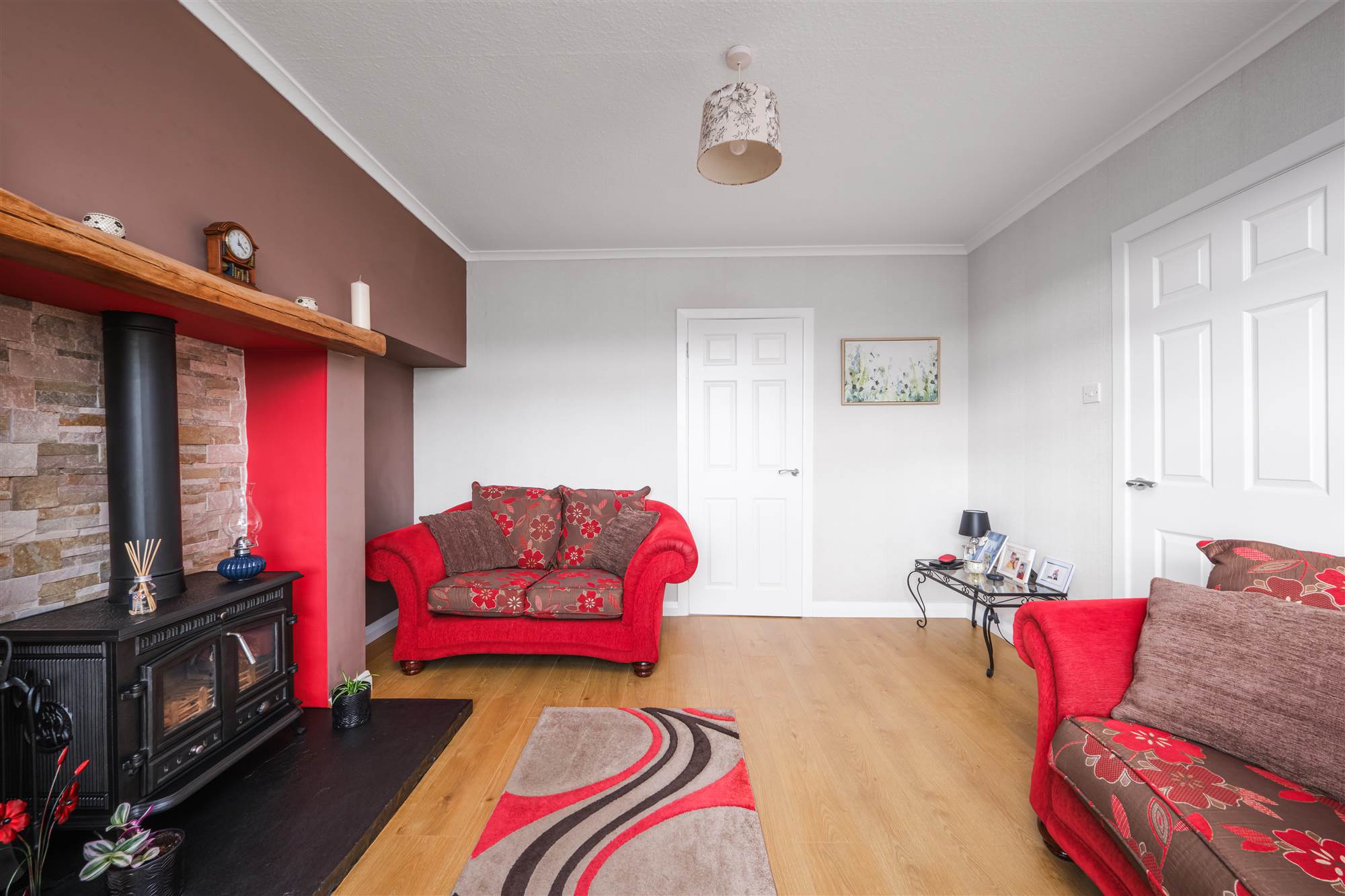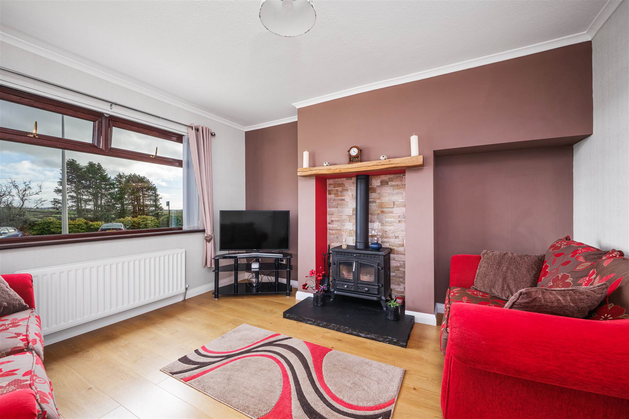 With log burning stove with brick recess, slate hearth and pine mantle, laminate wood floor and coving.