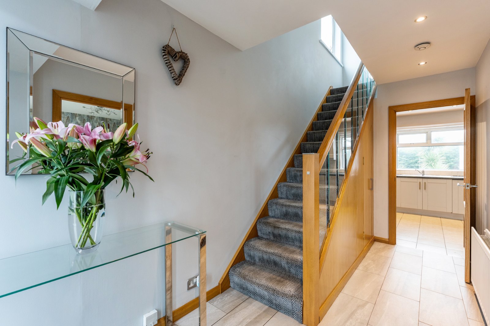 Ceramic tiled floor, LED recessed spotlighting, under stairs storage, glazed door to Lounge.