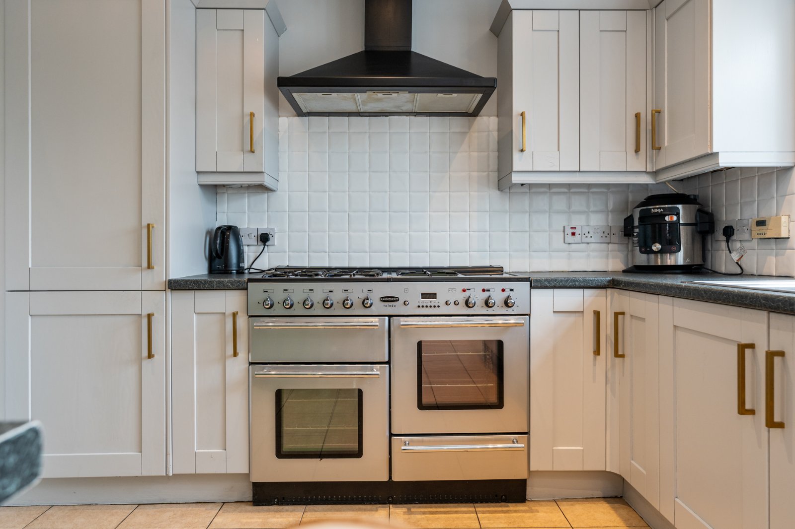 1.5 tub single drainer stainless steel sink unit with mixer taps, range of high and low level painted light grey and heritage green shaker style units, Formica roll edge work surfaces, 110 Rangemaster cooker, black extractor hood, integrated fridge freezer and dishwasher, display cabinet, concealed lighting, breakfast bar, wall tiling, ceramic tiled floor, LED recessed spotlighting, uPVC double glazed French doors to Conservatory.