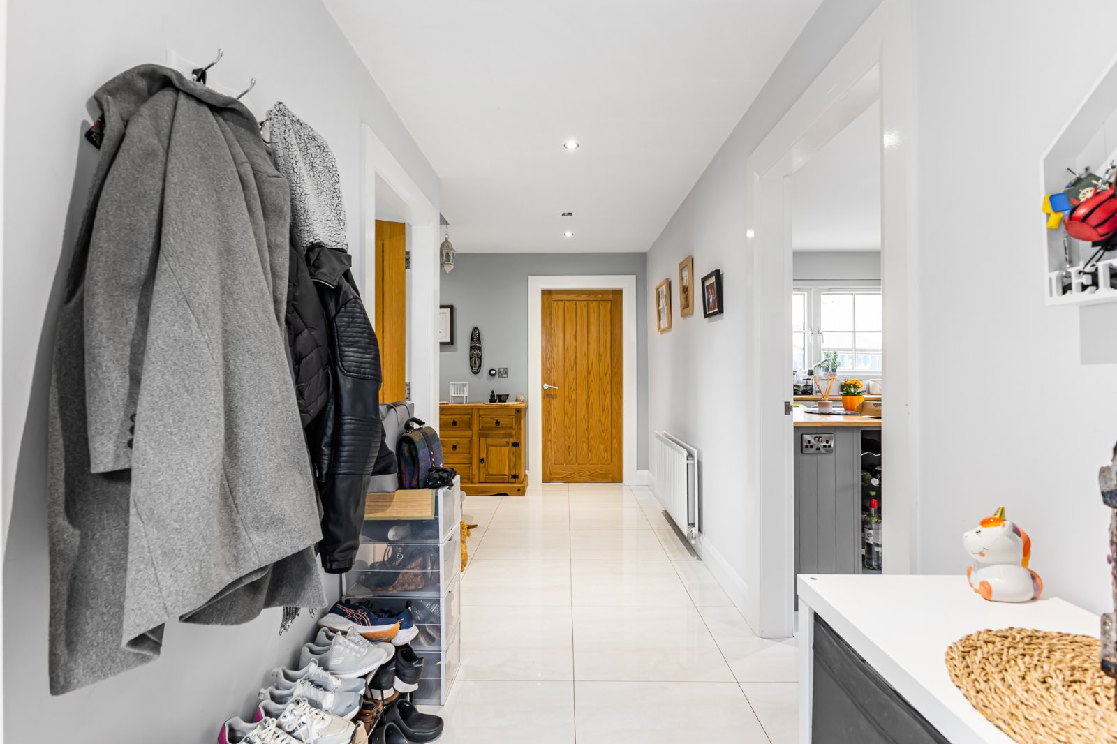 Hardwood double glazed front door, ceramic tiled floor, recessed spotlights, Google Nest smart thermostat, under stairs storage cupboard.